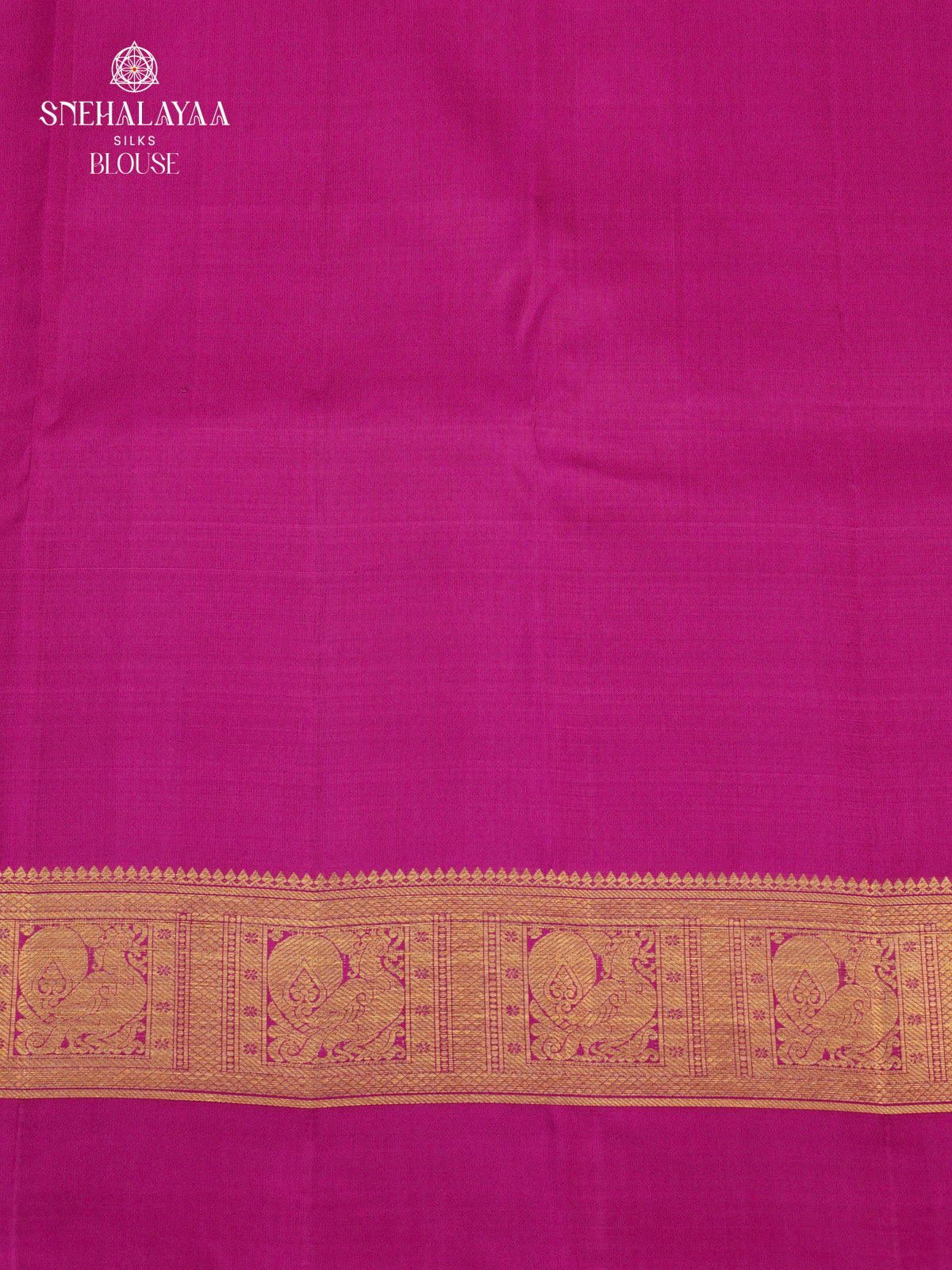 This is an elegant magenta Kanjivaram silk saree featuring intricate gold zari work and a traditional peacock-motif border. The body is adorned with classic paisley buttas and vertical grid patterns, embodying timeless South Indian craftsmanship.
