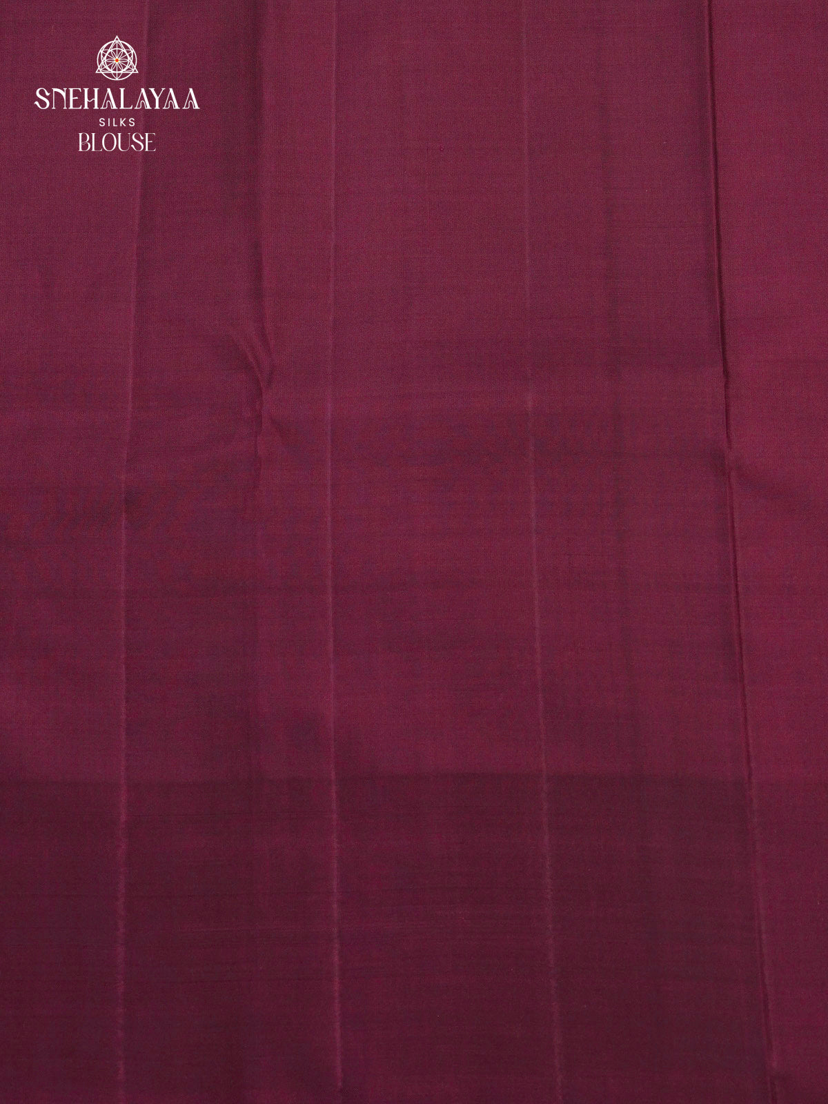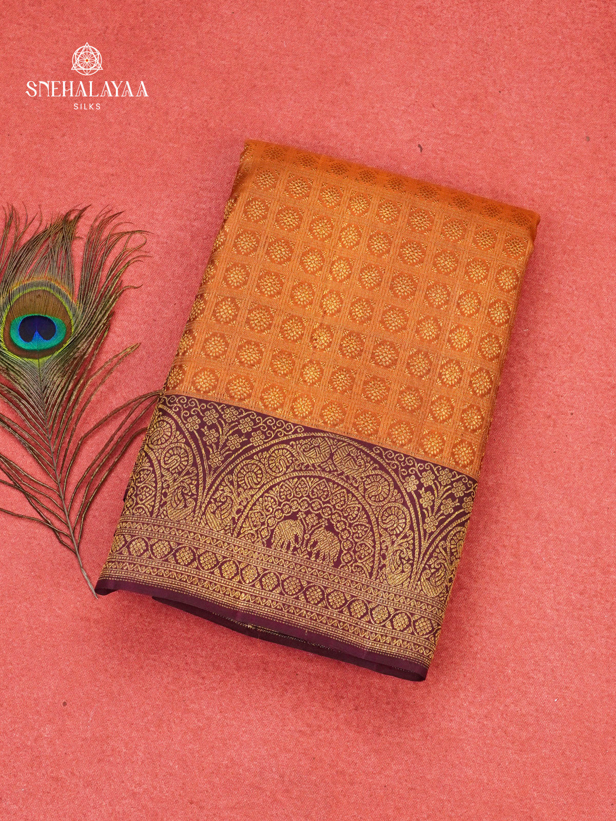 This elegant Kanjivaram silk saree features a orange body adorned with intricate floral butta checks, exuding a timeless traditional charm. The look is anchored by a striking deep wine border showcasing elaborate zari work with regal elephant and floral motifs.