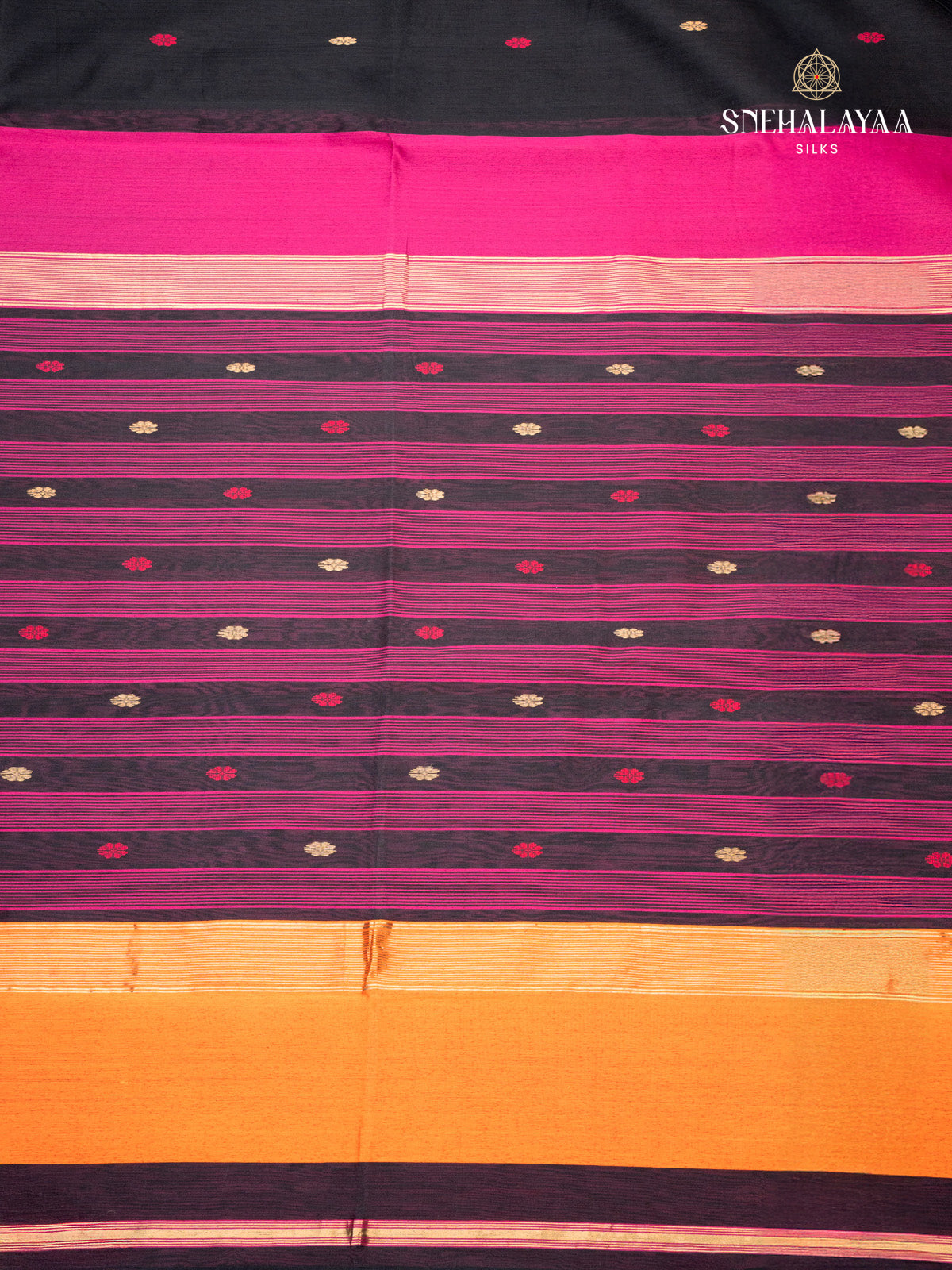 A Maheswari silk cotton saree with butta and zari border is a perfect blend of elegance and tradition. Made from a mix of silk and cotton, it offers a light yet luxurious feel. The saree features intricate butta woven throughout the fabric.