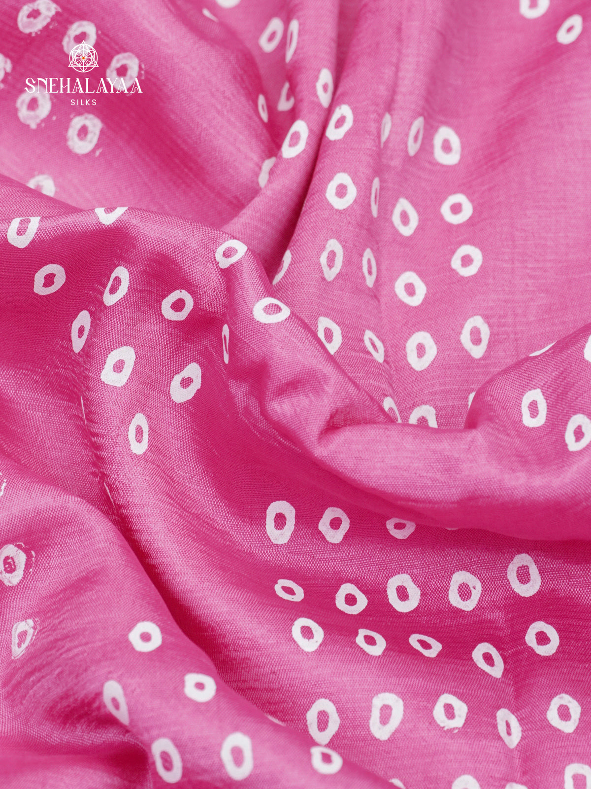 Soft baby pink Mangalagiri silk cotton saree featuring a traditional bandhani dot design across the body, crisp handwoven texture with a lightweight feel and a clean, well-defined finish.