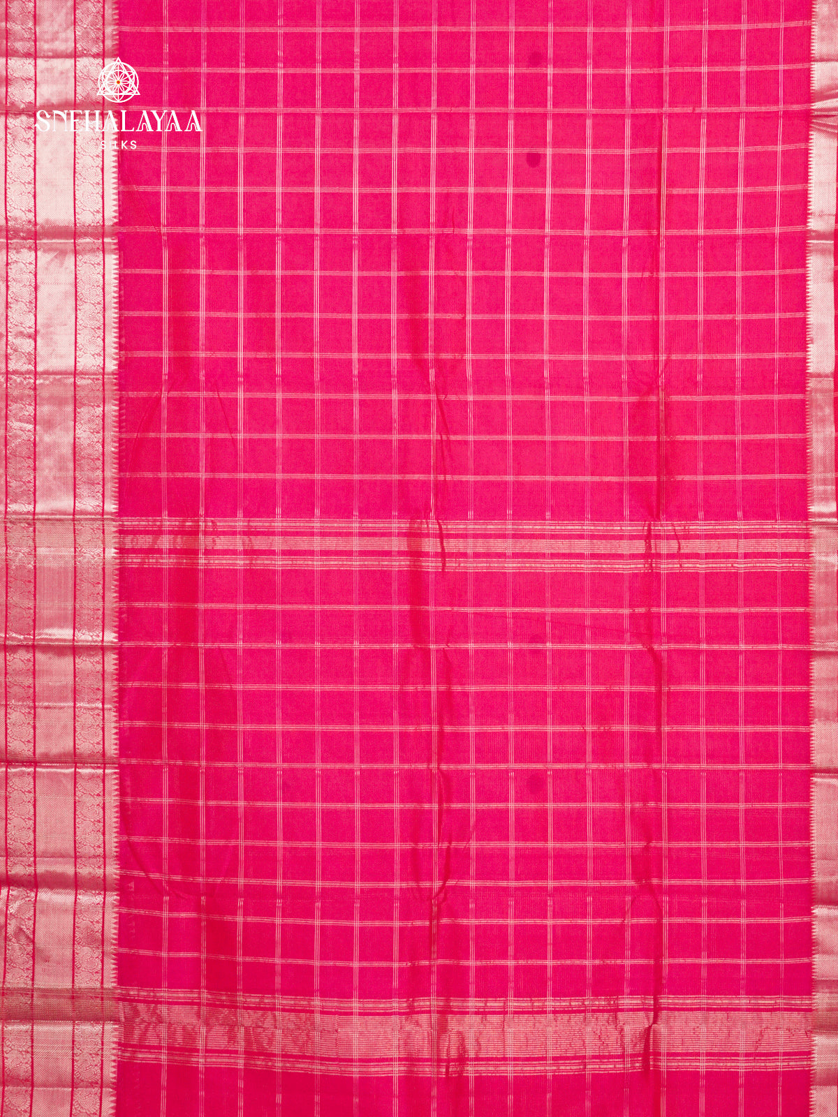Vibrant rani pink Mangalagiri silk cotton saree with a subtle checkered body and a richly woven floral zari border, crisp texture with a refined, structured finish.