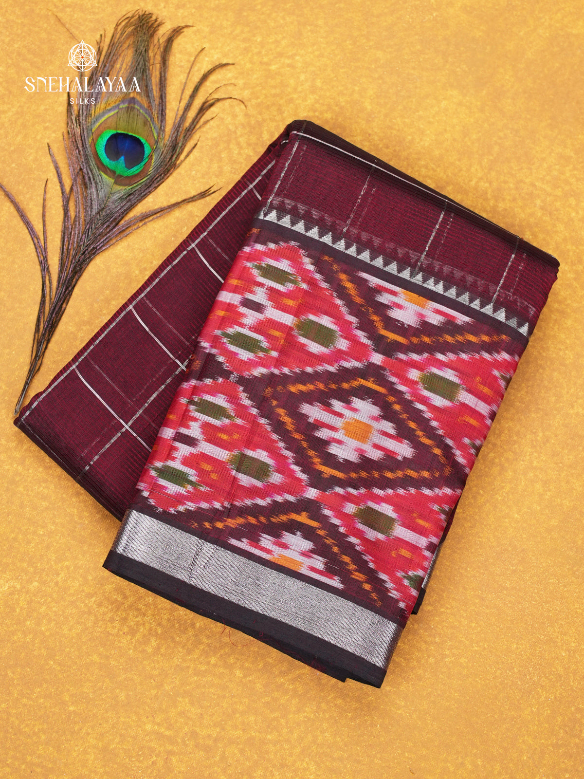 Rich maroon Mangalagiri silk cotton saree with a fine checked body and traditional ikat design detailing along the border, crisp texture with a strong, structured finish.