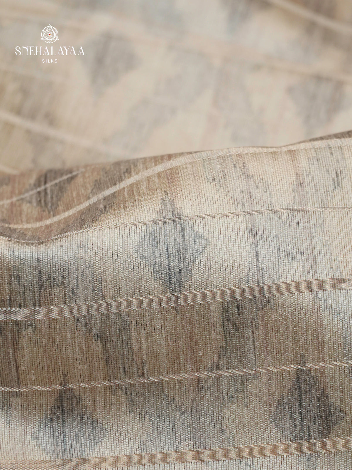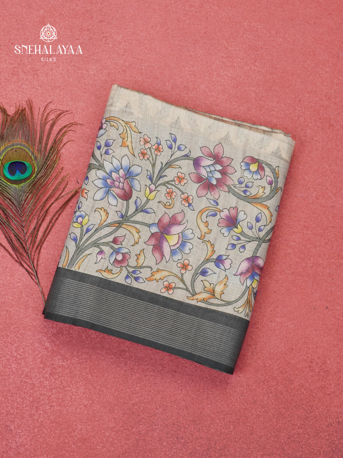 The munga tussar saree showcases delicate floral prints that flow gracefully across the entire body, creating a timeless and elegant look. Its soft texture and vibrant design make it perfect for any occasion.