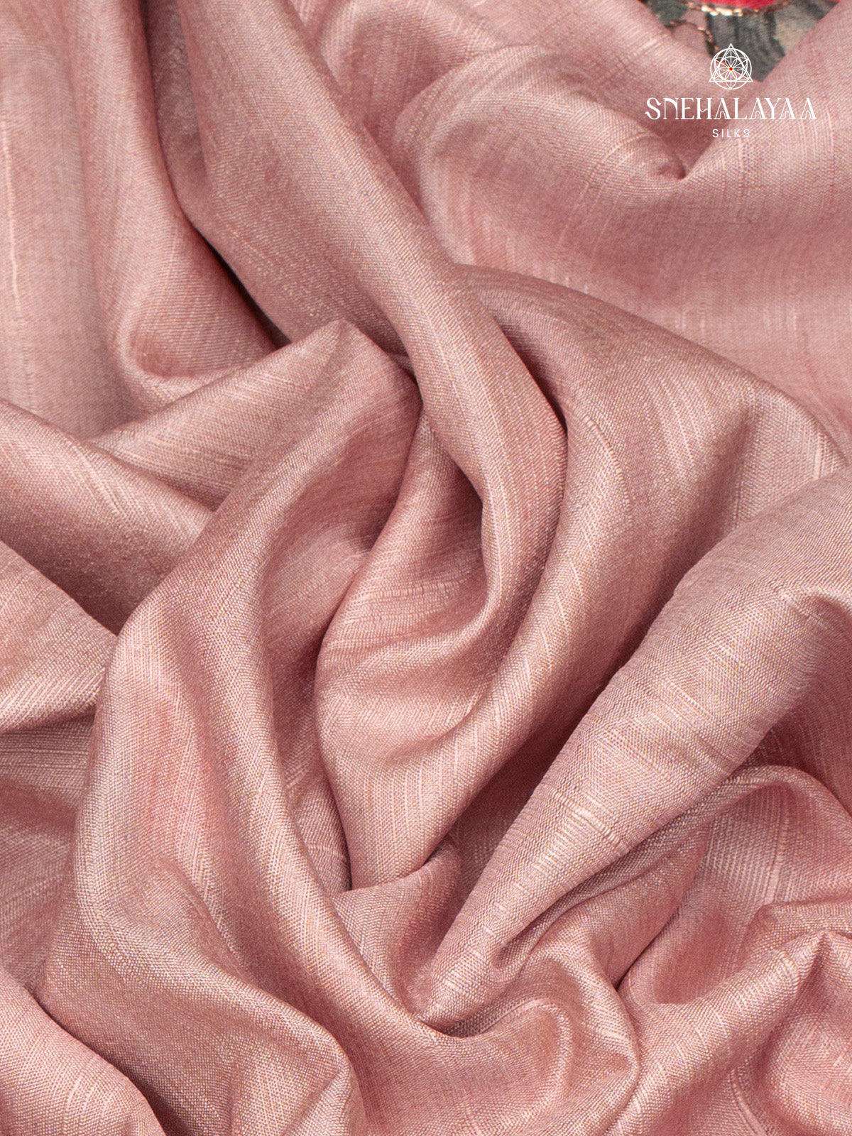 A Tussar saree with floral prints features delicate, handwoven fabric with rich texture, adorned with vibrant, nature-inspired floral patterns. Its rustic charm and elegant design make it a perfect blend of traditional and contemporary style.