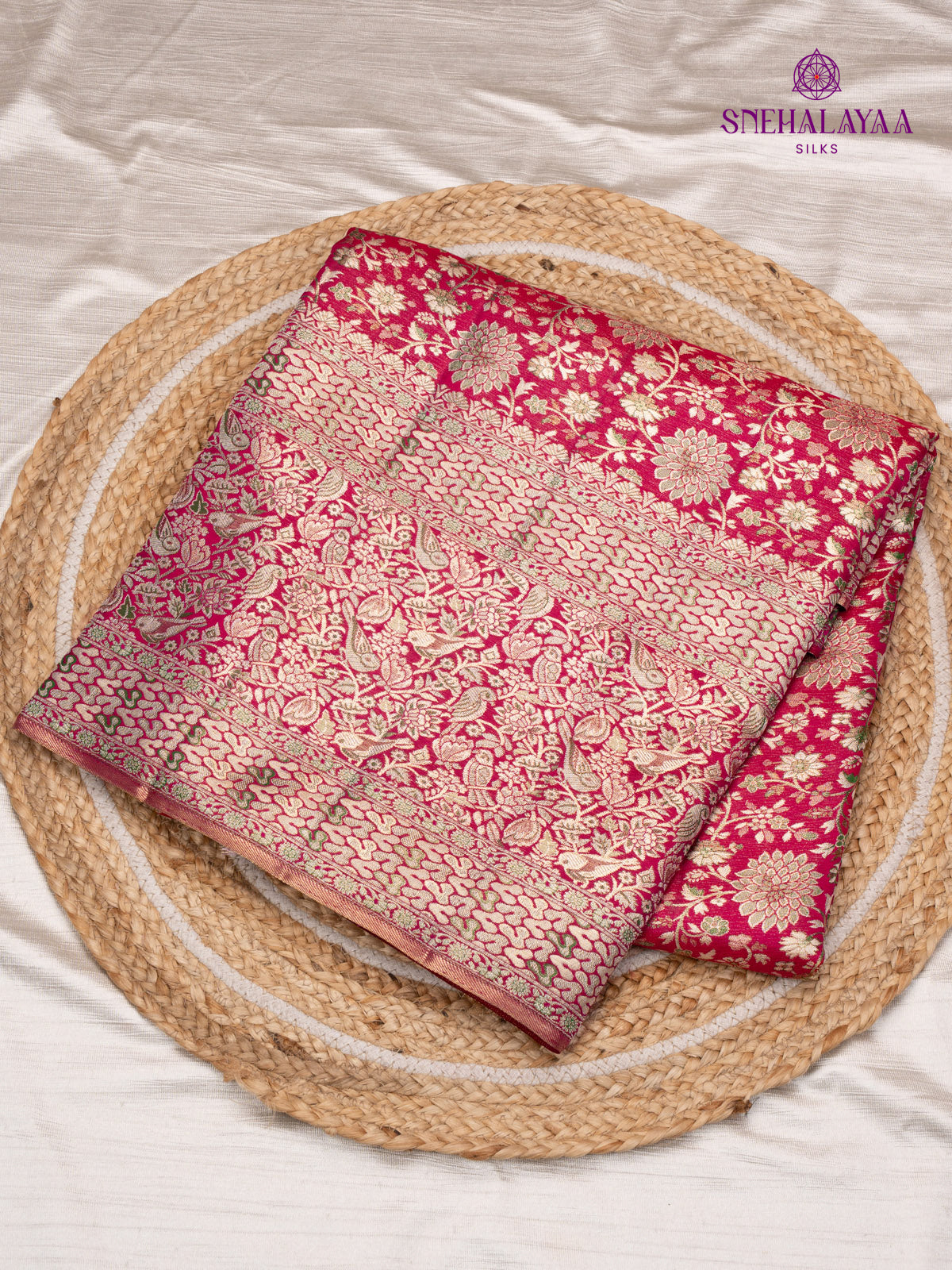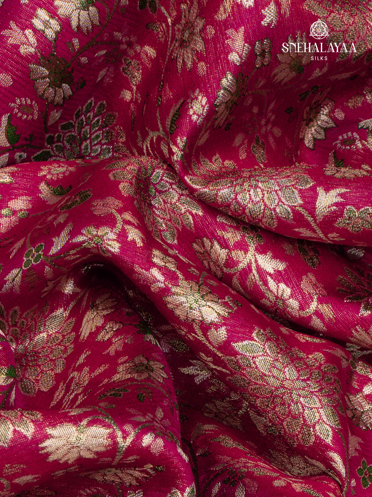 Tissue Kanjivaram Silk Saree showcases intricate floral and parrot motifs that exude timeless elegance. The contrasting pallu adds a vibrant touch, enhancing its luxurious and festive appeal.