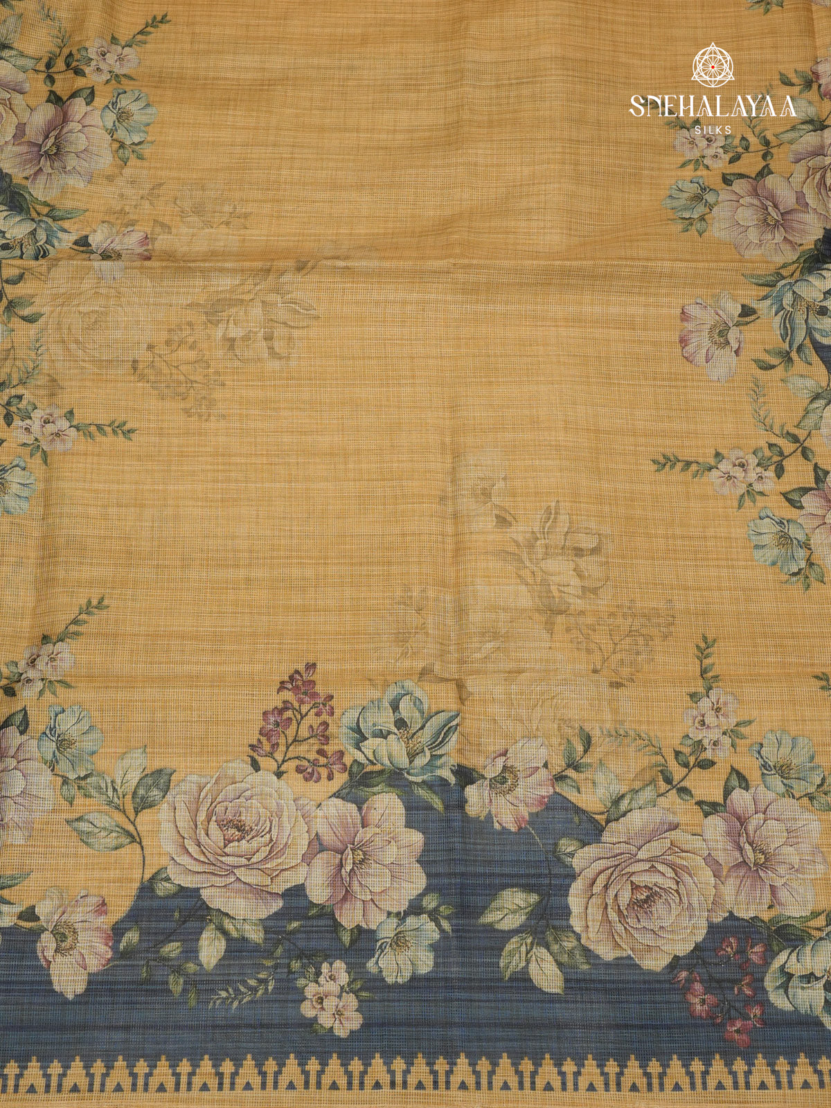 mustard Yellow With Teal Blue Printed Kota Saree