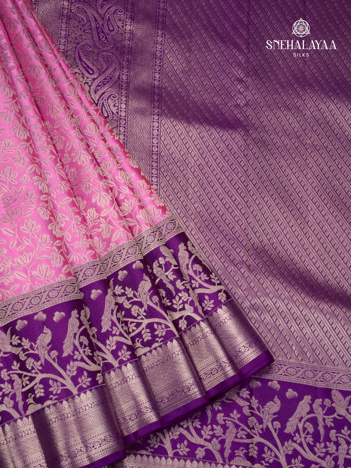 Kanjivaram silk featuring delicate floral motifs (Kodi Visiri) woven onto the body. Its classic look is completed with a dramatically contrasting border and pallu