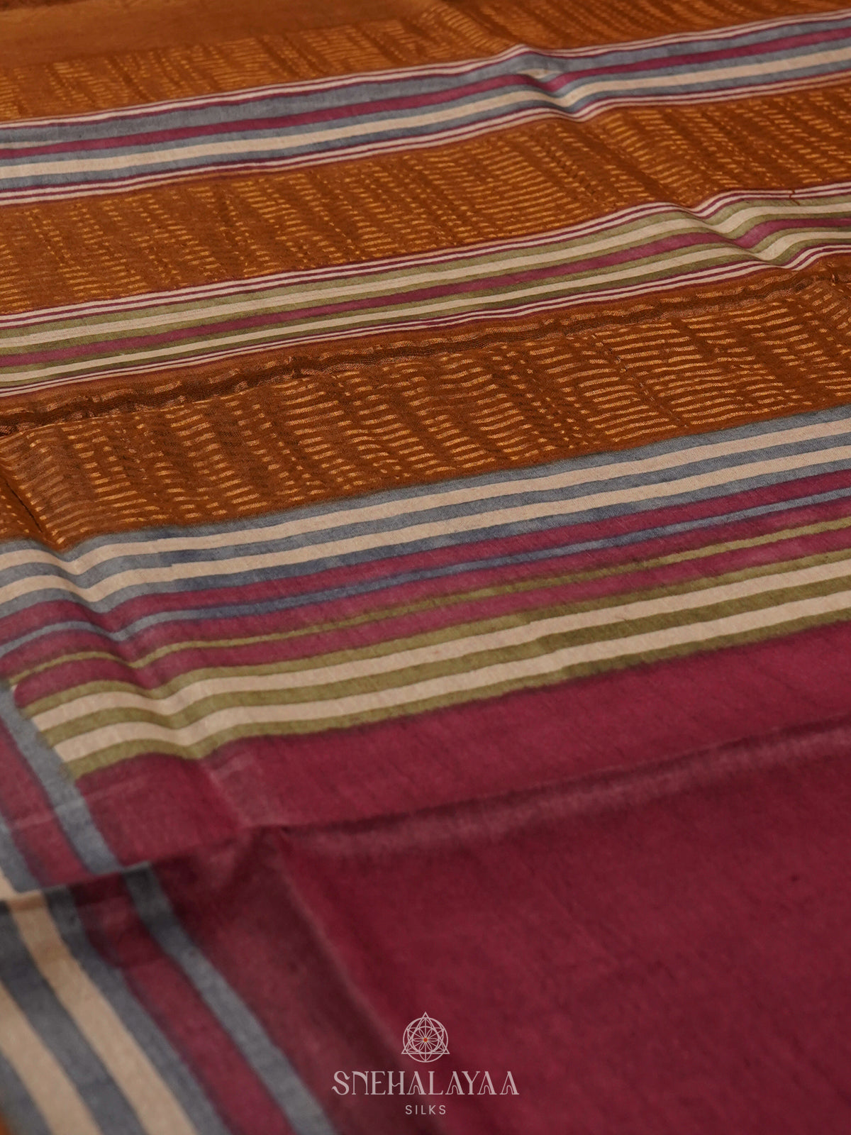 A Tussar saree features a natural golden glow and a rich, textured weave from wild silk. It reflects timeless elegance with an earthy, handcrafted appeal.