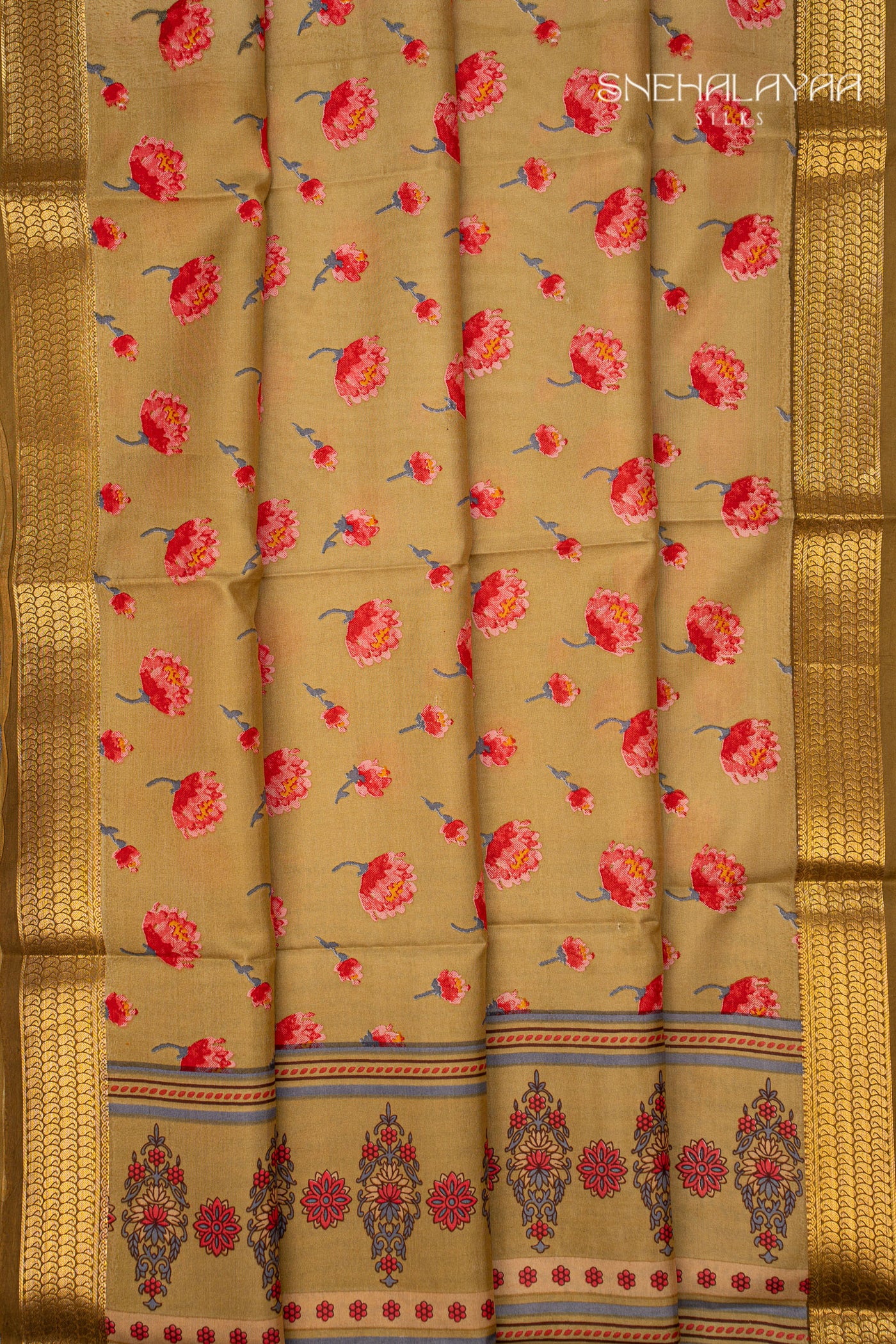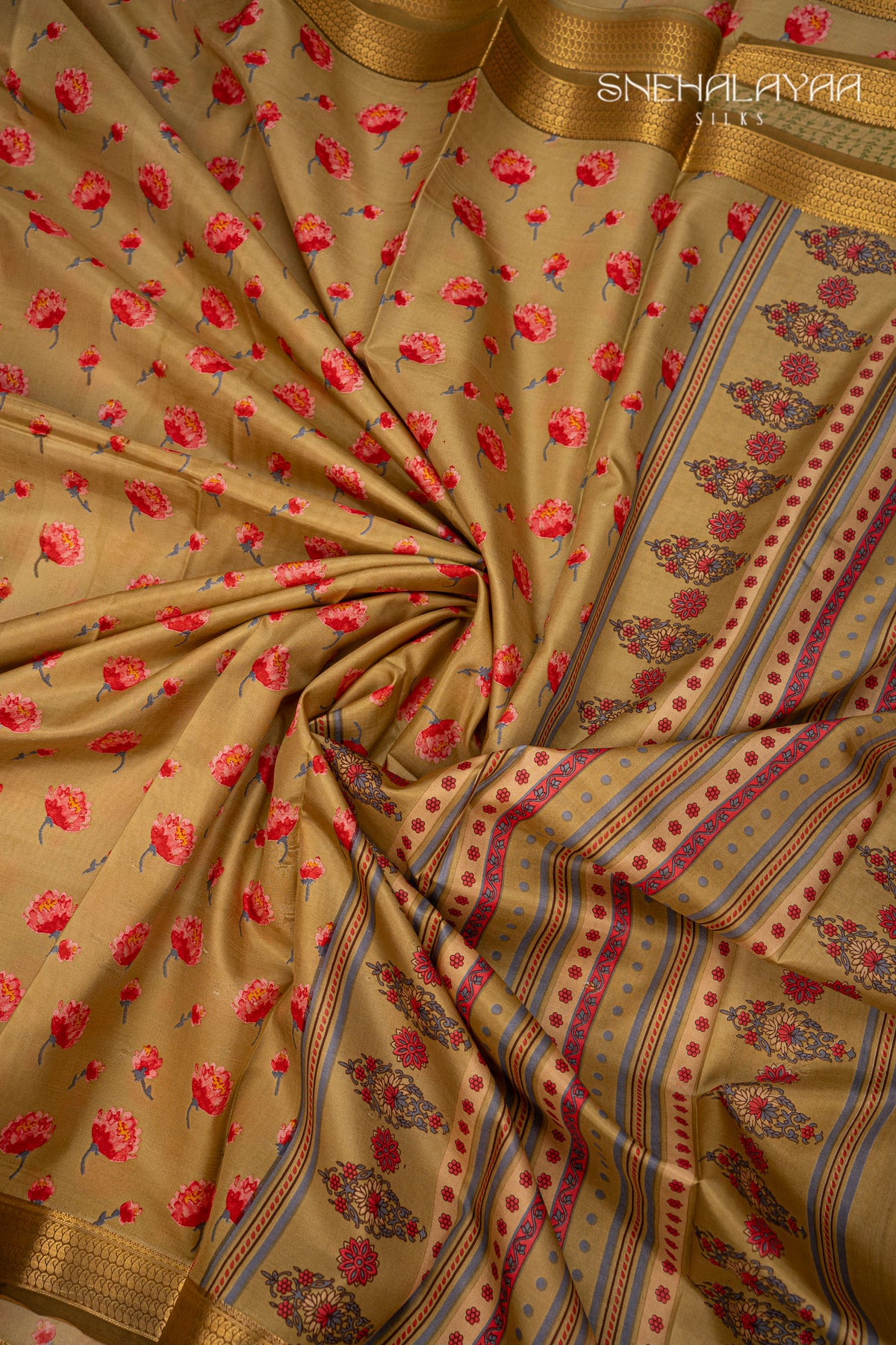 Olive Green Printed Mysore Silk Saree