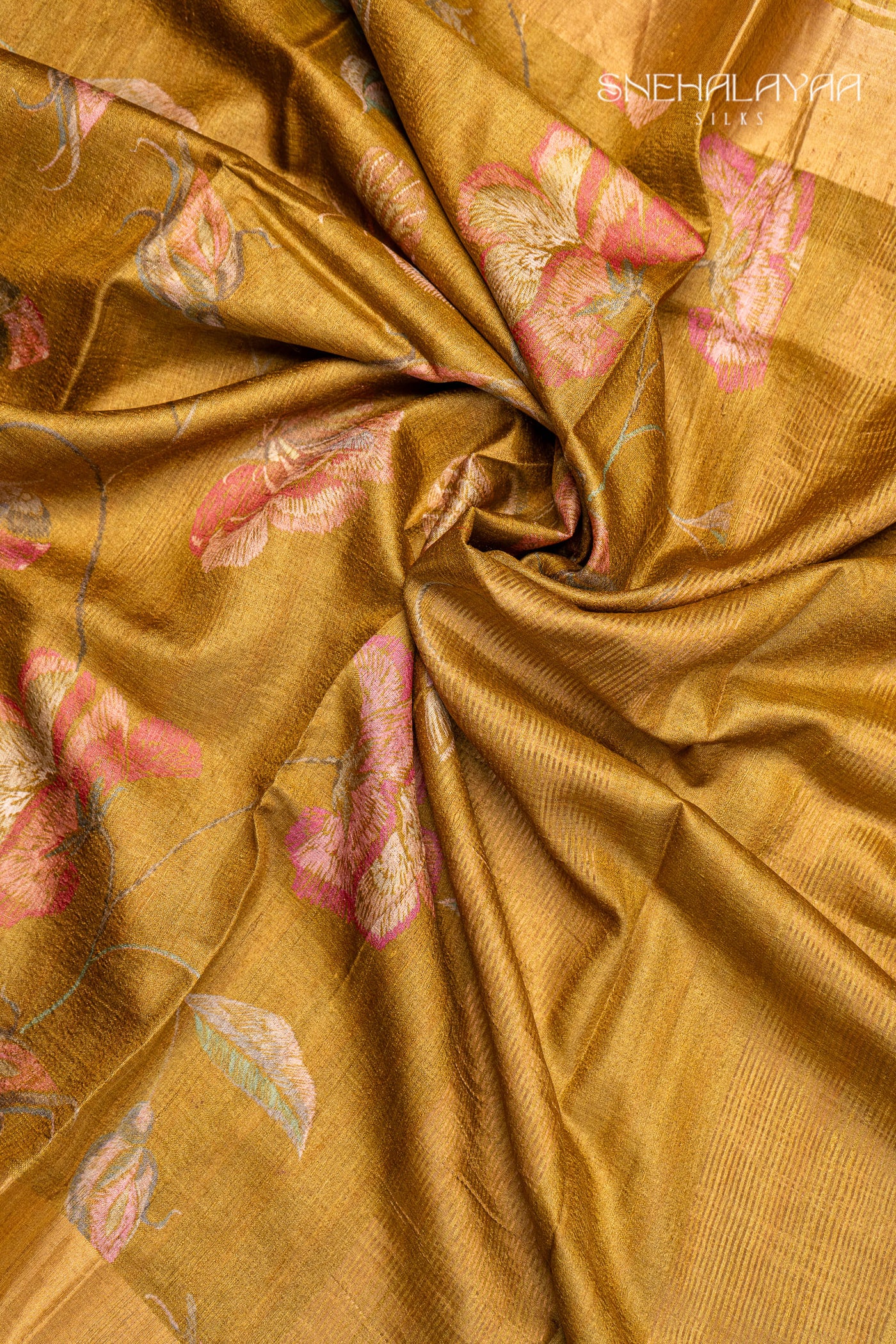 This printed tussar saree is a delightful and vibrant choice that combines the elegance of traditional silk with a playful touch of color.