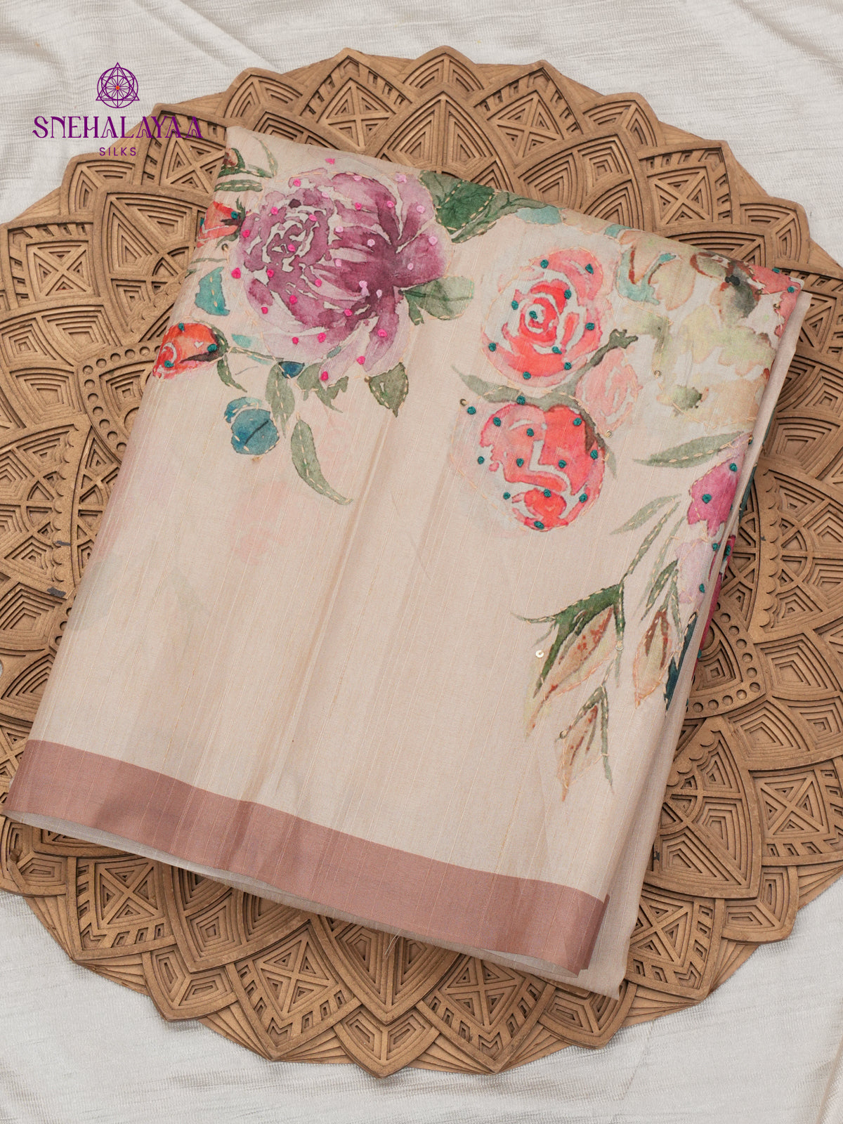 A Tussar embroidery saree showcases the natural texture and earthy elegance of Tussar silk enhanced with intricate handcrafted embroidery. It offers a refined, graceful look ideal for festive occasions and elegant daytime wear.