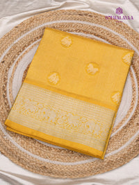 The saree is in vibrant yellow color with intricate zari work. The body features a rich golden-yellow shade, while the border has delicate silver zari patterns, including elephants, which add to its traditional charm.