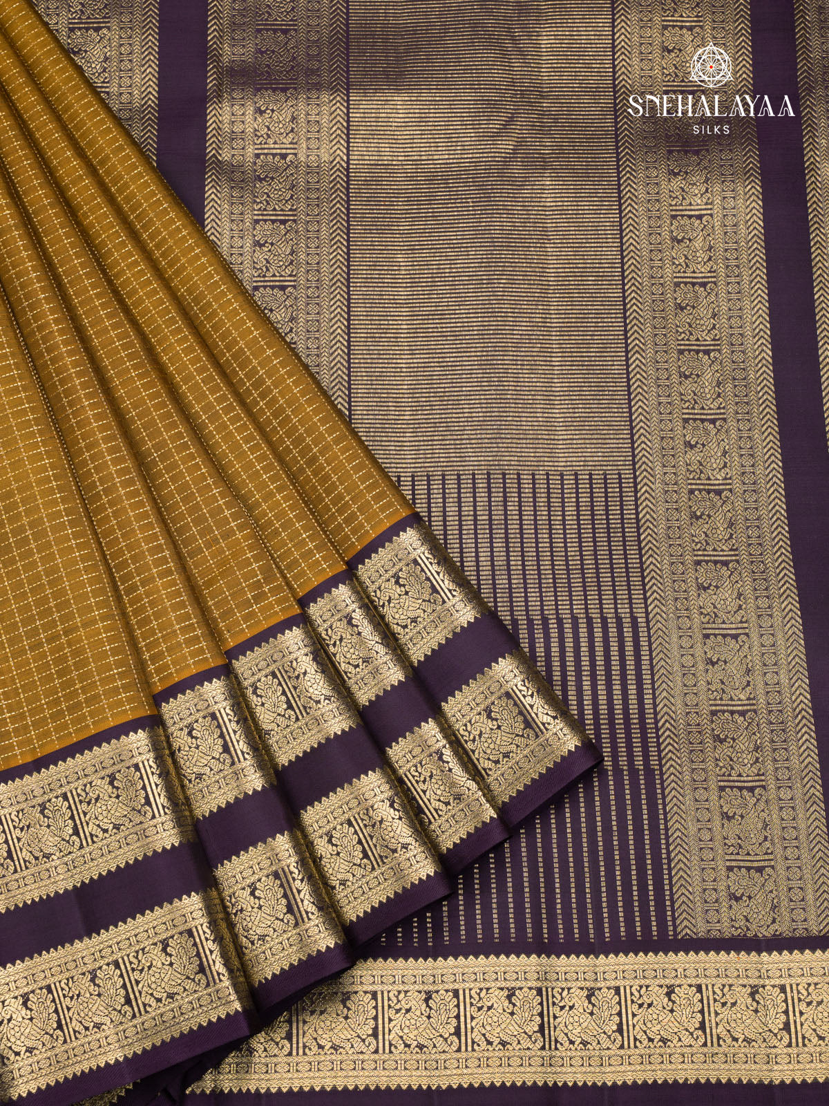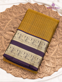 Classic Kanjivaram silk saree adorned with elegant check patterns running seamlessly across the body. A refined drape that combines traditional charm with understated sophistication.