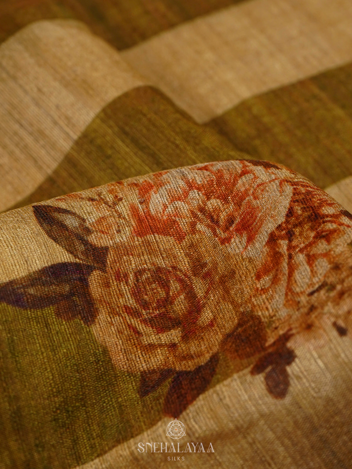 A luxurious Munga Tussar saree adorned with elegant prints for a timeless ethnic look. Its natural sheen and soft texture bring effortless grace to every occasion.