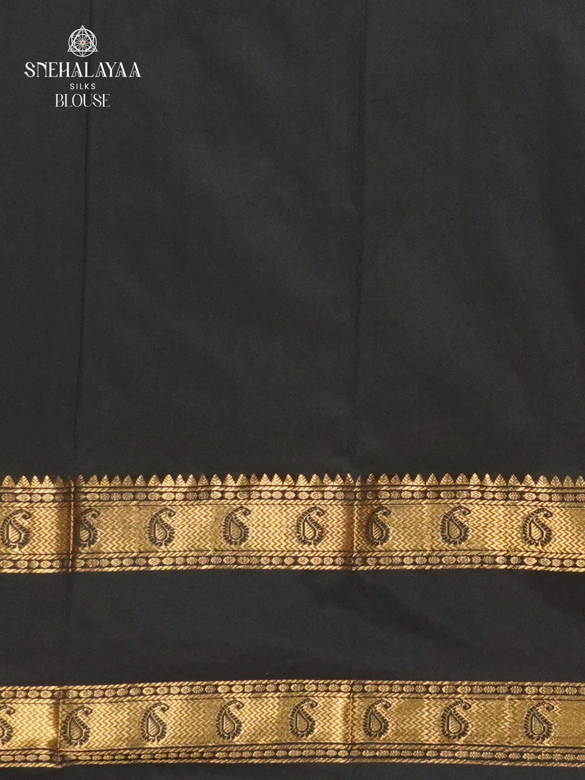 Yellow Kanjivaram silk saree features a contrasting black border and pallu, richly adorned with traditional golden zari paisley (mango) motifs. The elegant design is elevated by a distinct temple-style korvai border, seamlessly blending classic craftsmanship with a bold, sophisticated color palette.