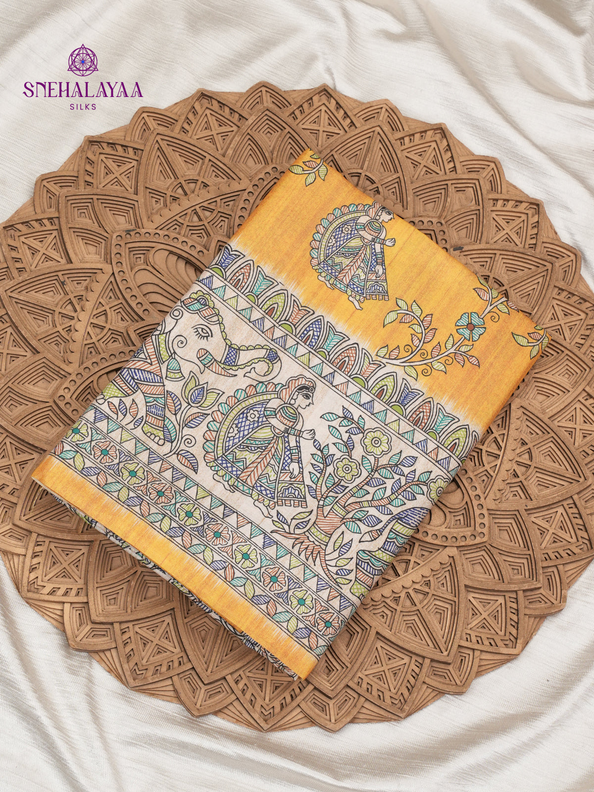 A printed Madhubani saree features intricate folk motifs inspired by traditional Mithila art. Its vibrant patterns and hand-drawn detailing bring a touch of cultural elegance to any look.
