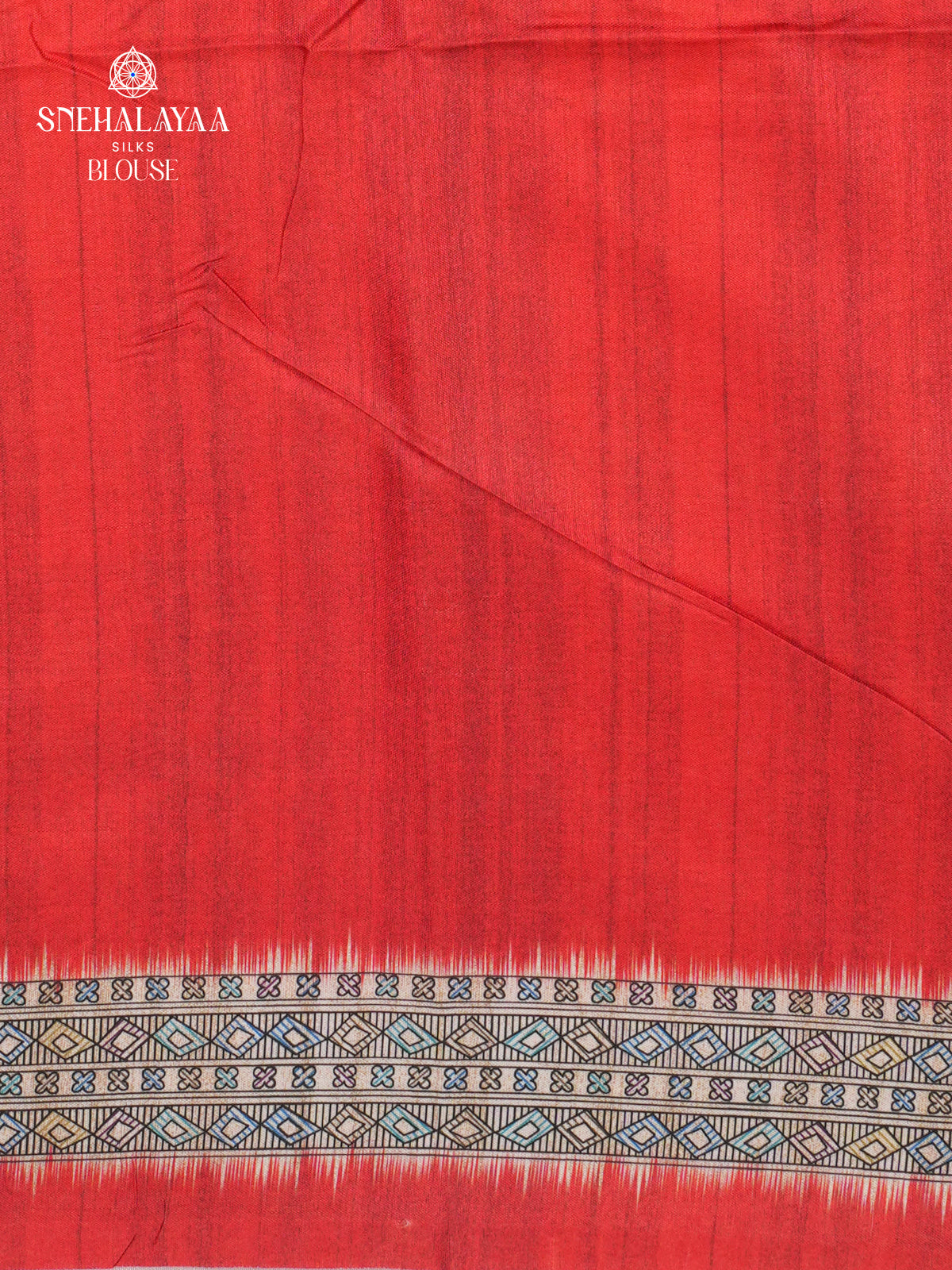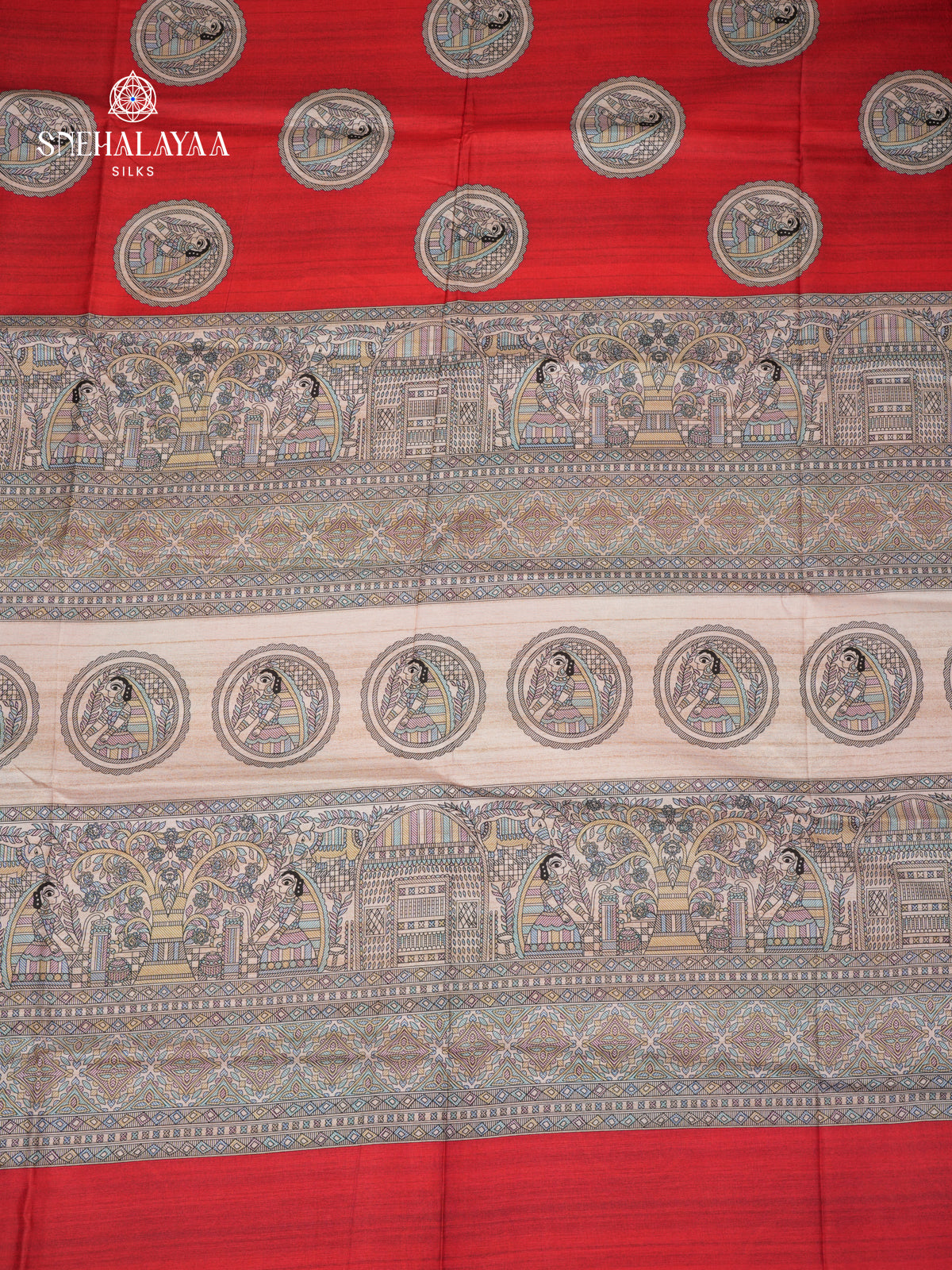 A printed Madhubani saree features intricate folk motifs inspired by traditional Mithila art. Its vibrant patterns and hand-drawn detailing bring a touch of cultural elegance to any look.