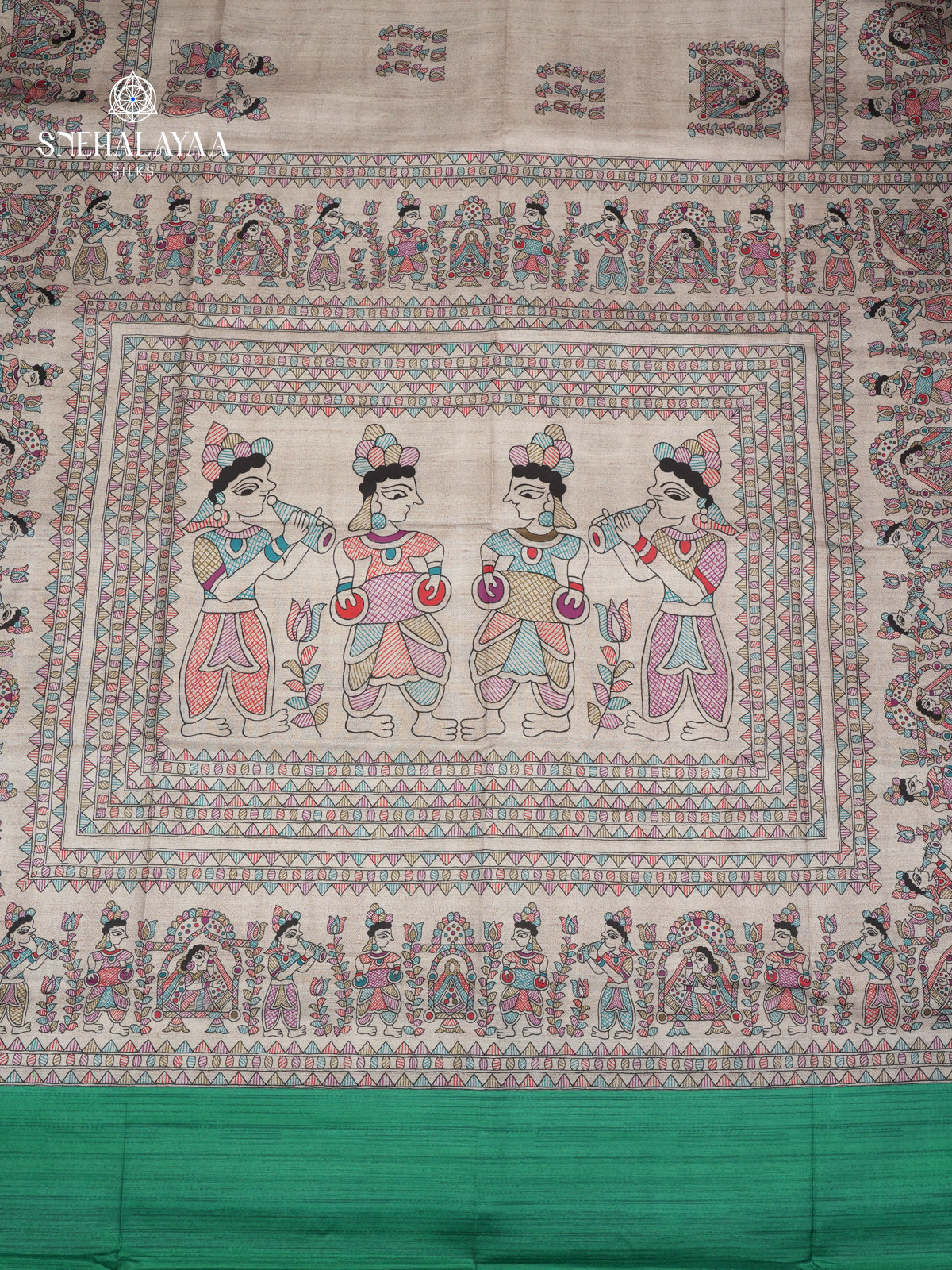 Beige With Green Border Madhubani Saree