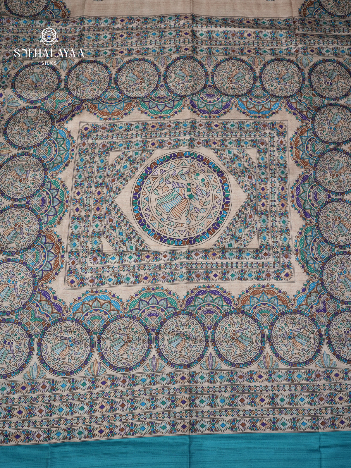 A printed Madhubani saree features intricate folk motifs inspired by traditional Mithila art. Its vibrant patterns and hand-drawn detailing bring a touch of cultural elegance to any look.