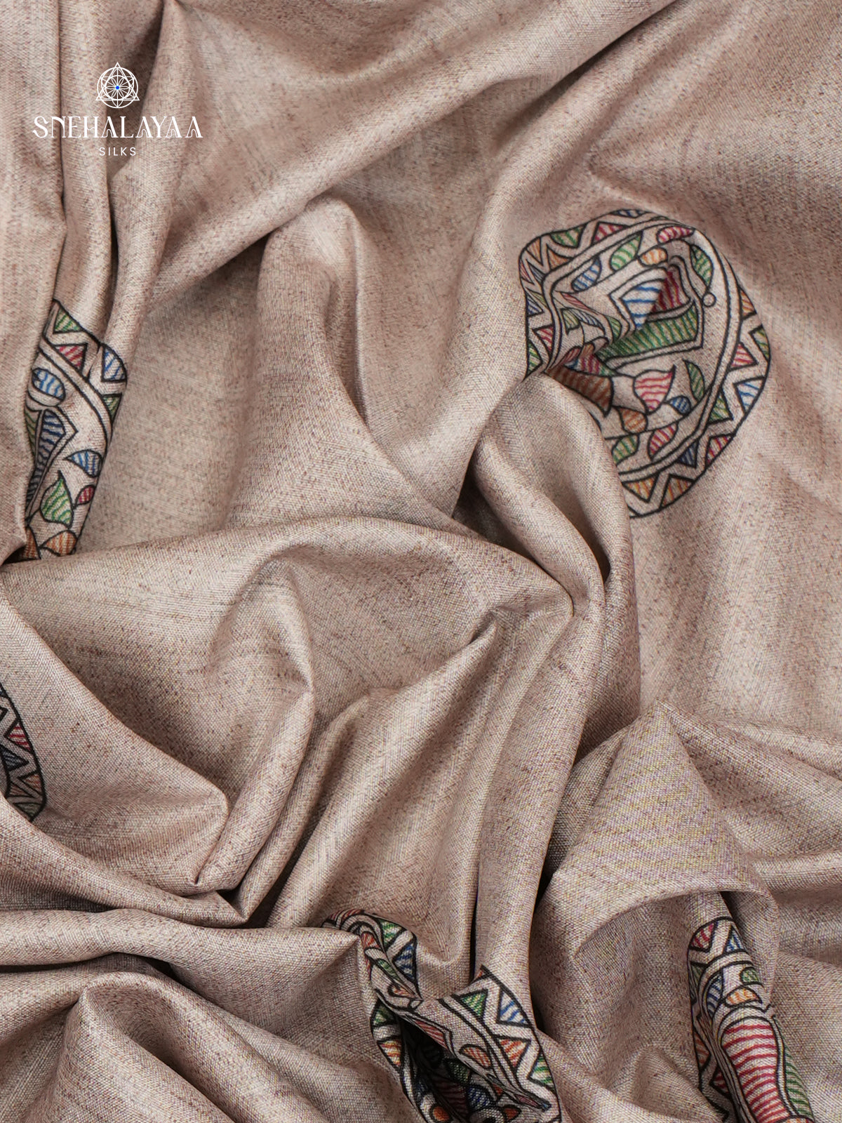 A printed Madhubani saree features intricate folk motifs inspired by traditional Mithila art. Its vibrant patterns and hand-drawn detailing bring a touch of cultural elegance to any look.