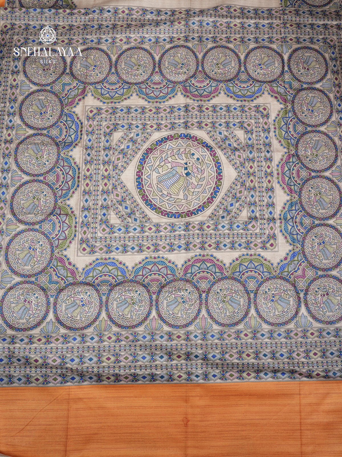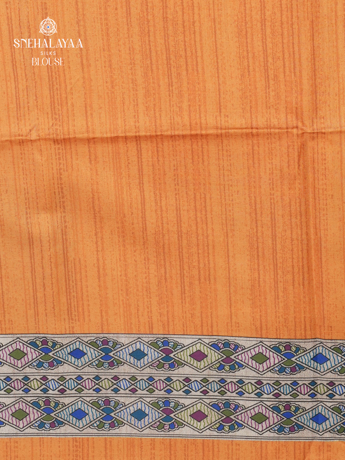 A printed Madhubani saree features intricate folk motifs inspired by traditional Mithila art. Its vibrant patterns and hand-drawn detailing bring a touch of cultural elegance to any look.