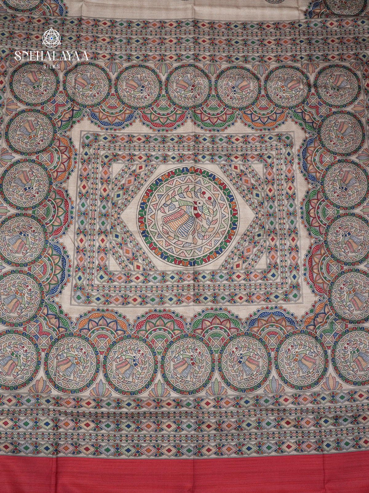 A printed Madhubani saree features intricate folk motifs inspired by traditional Mithila art. Its vibrant patterns and hand-drawn detailing bring a touch of cultural elegance to any look.