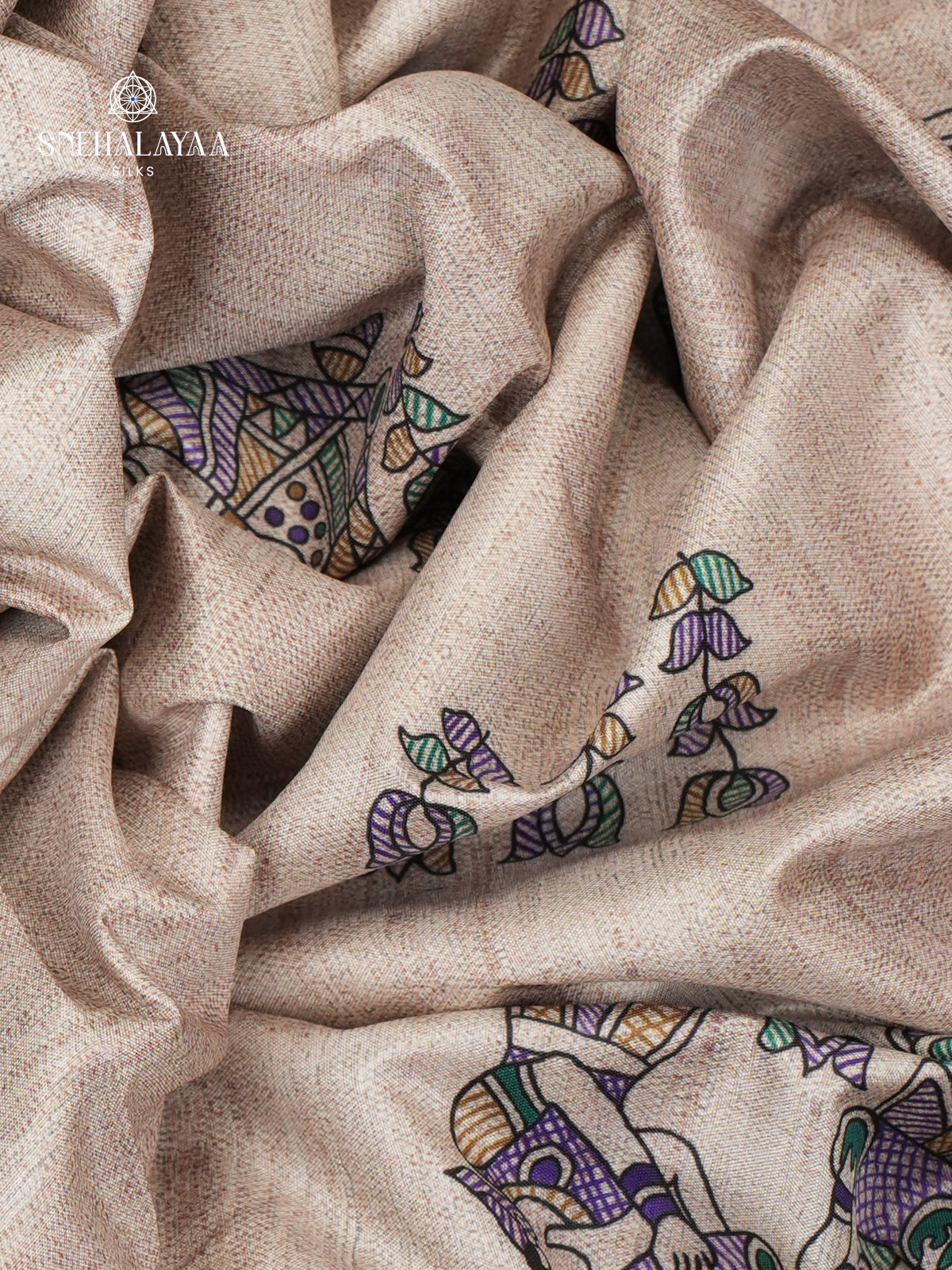 A printed Madhubani saree features intricate folk motifs inspired by traditional Mithila art. Its vibrant patterns and hand-drawn detailing bring a touch of cultural elegance to any look.