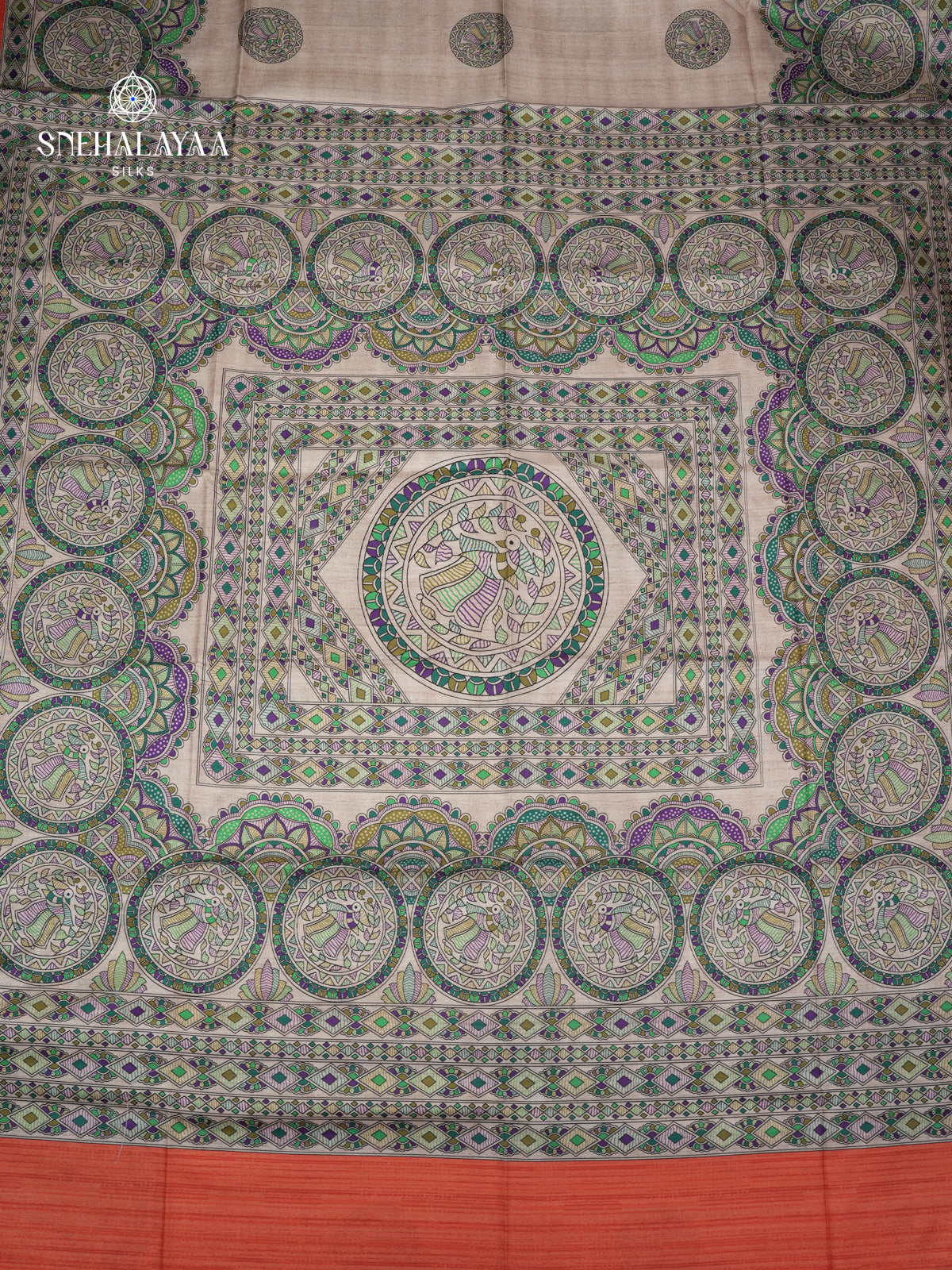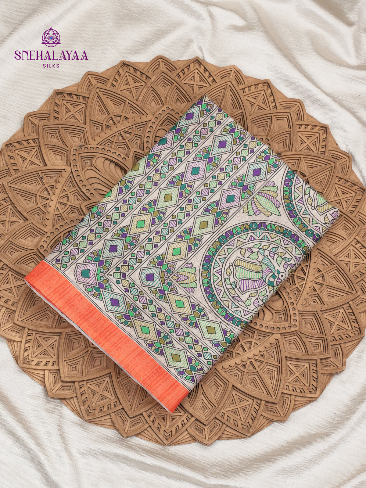A printed Madhubani saree features intricate folk motifs inspired by traditional Mithila art. Its vibrant patterns and hand-drawn detailing bring a touch of cultural elegance to any look.
