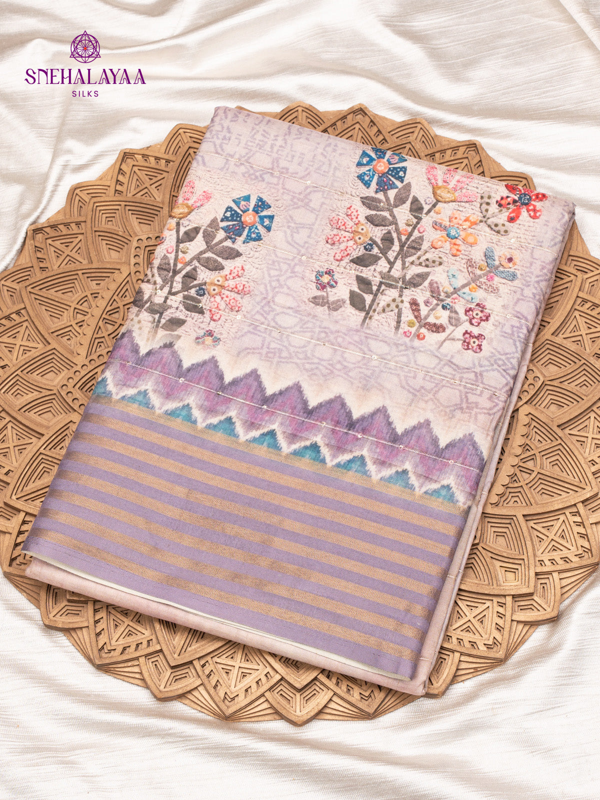A Tussar saree with floral prints features delicate, handwoven fabric with rich texture, adorned with vibrant, nature-inspired floral patterns. Its rustic charm and elegant design make it a perfect blend of traditional and contemporary style.