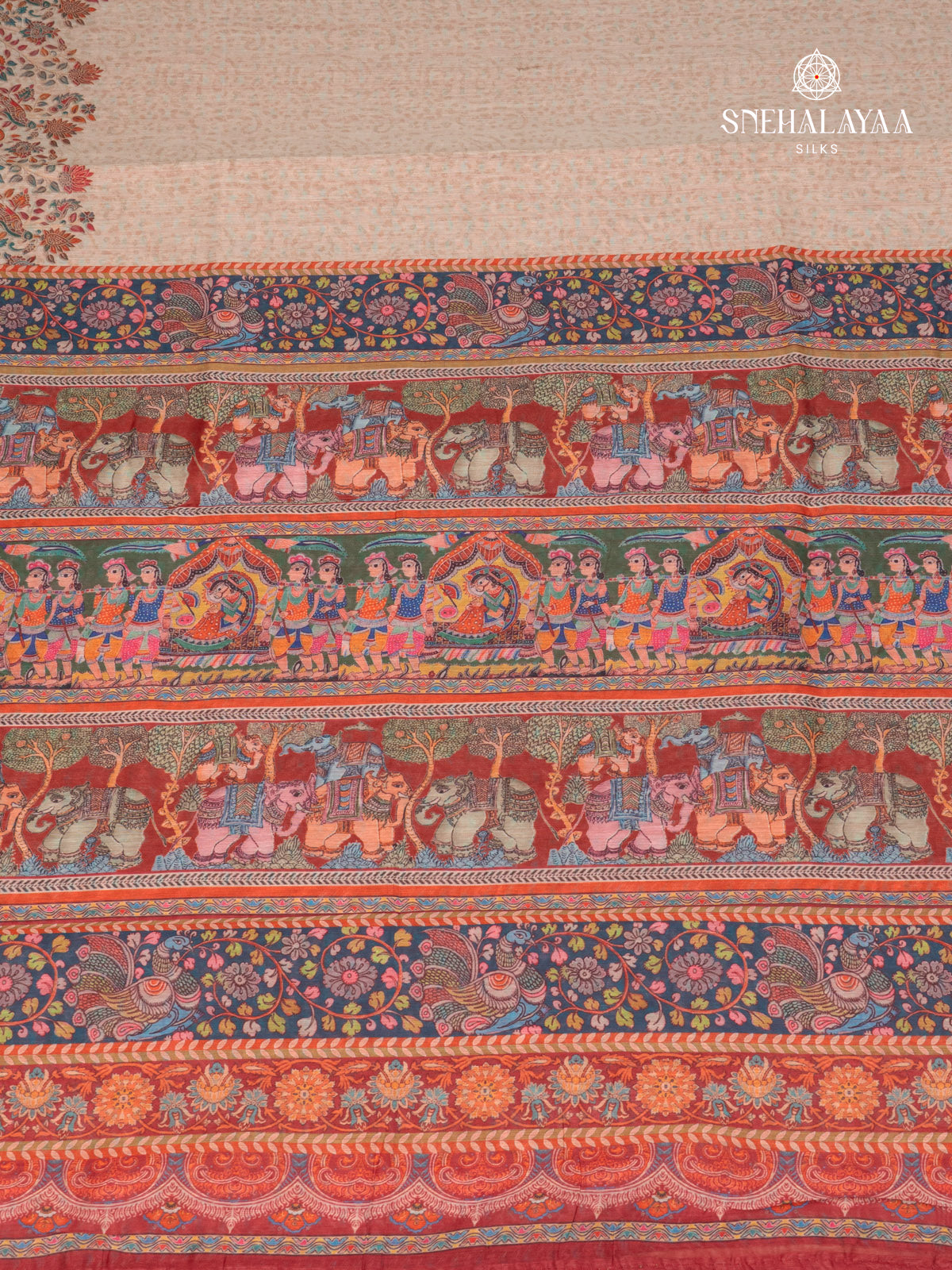 A lightweight, breathable linen saree featuring elegant printed patterns for a timeless, ethnic look. Perfect for everyday comfort or subtle festive styling with its soft texture and graceful drape.