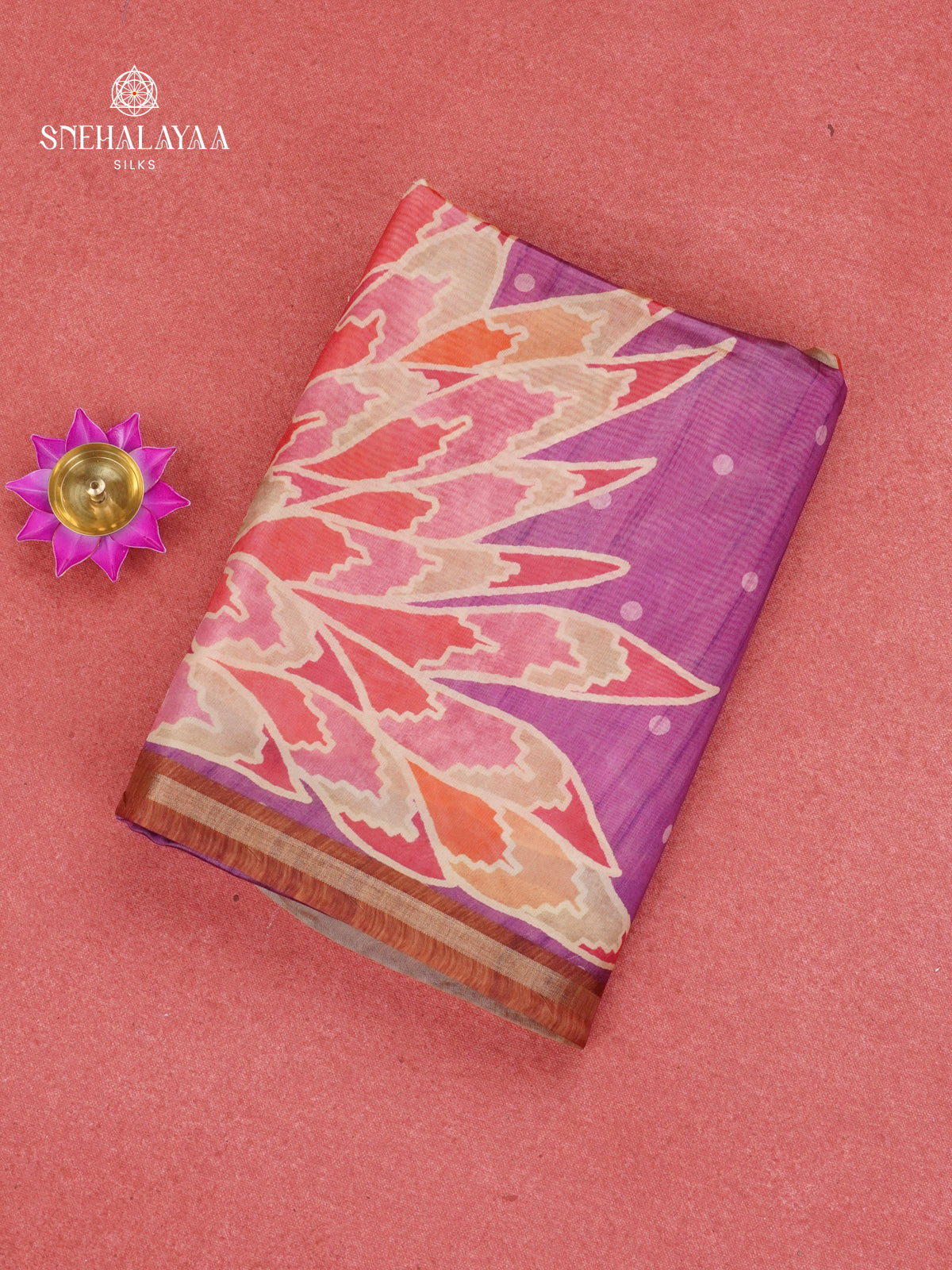 Purple semi jute saree featuring bold abstract leaf prints in warm coral and beige tones, accented with subtle polka dots and a muted brown border for a balanced, artistic finish.