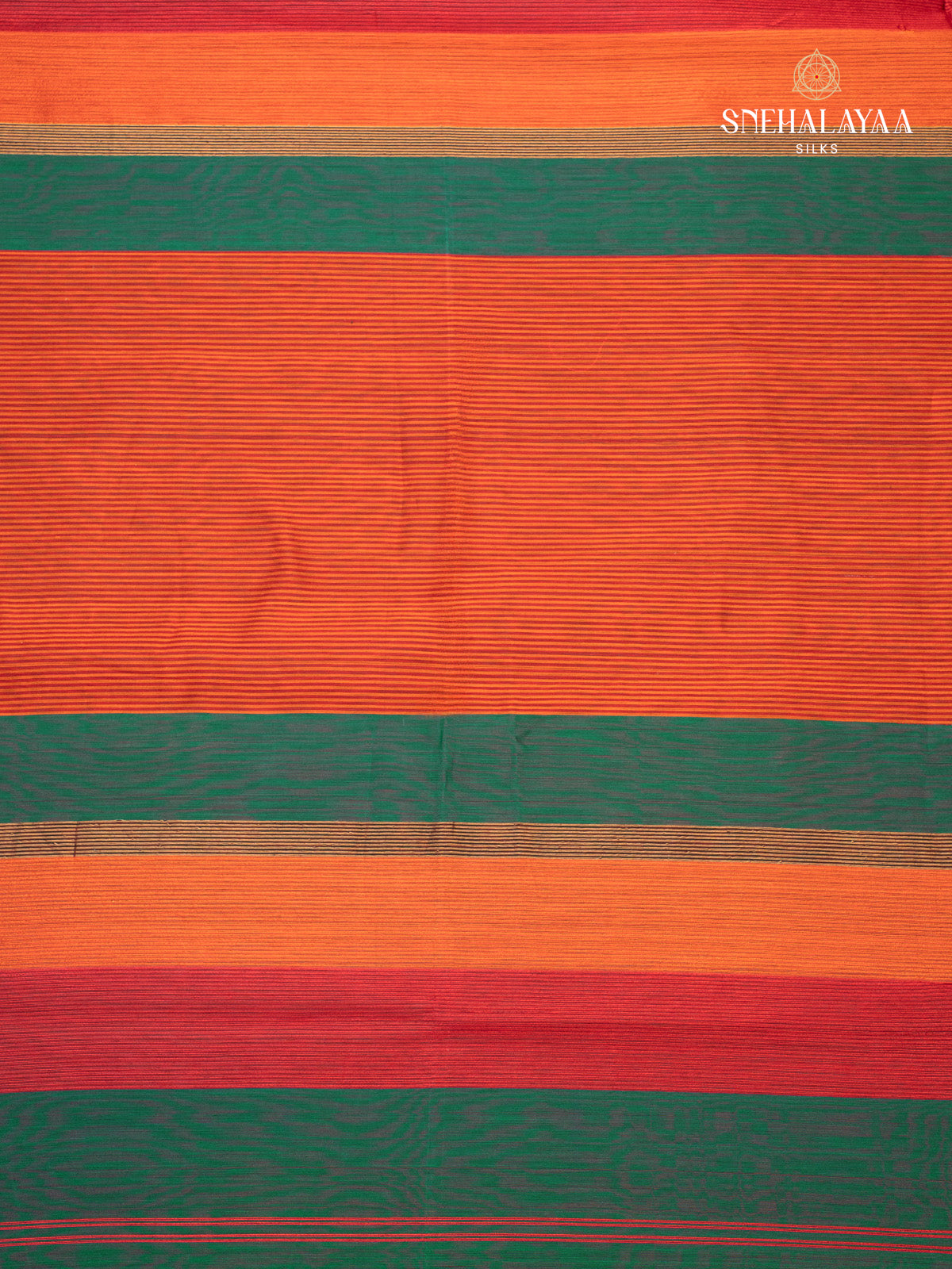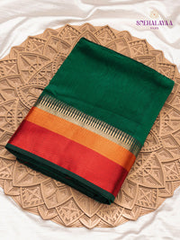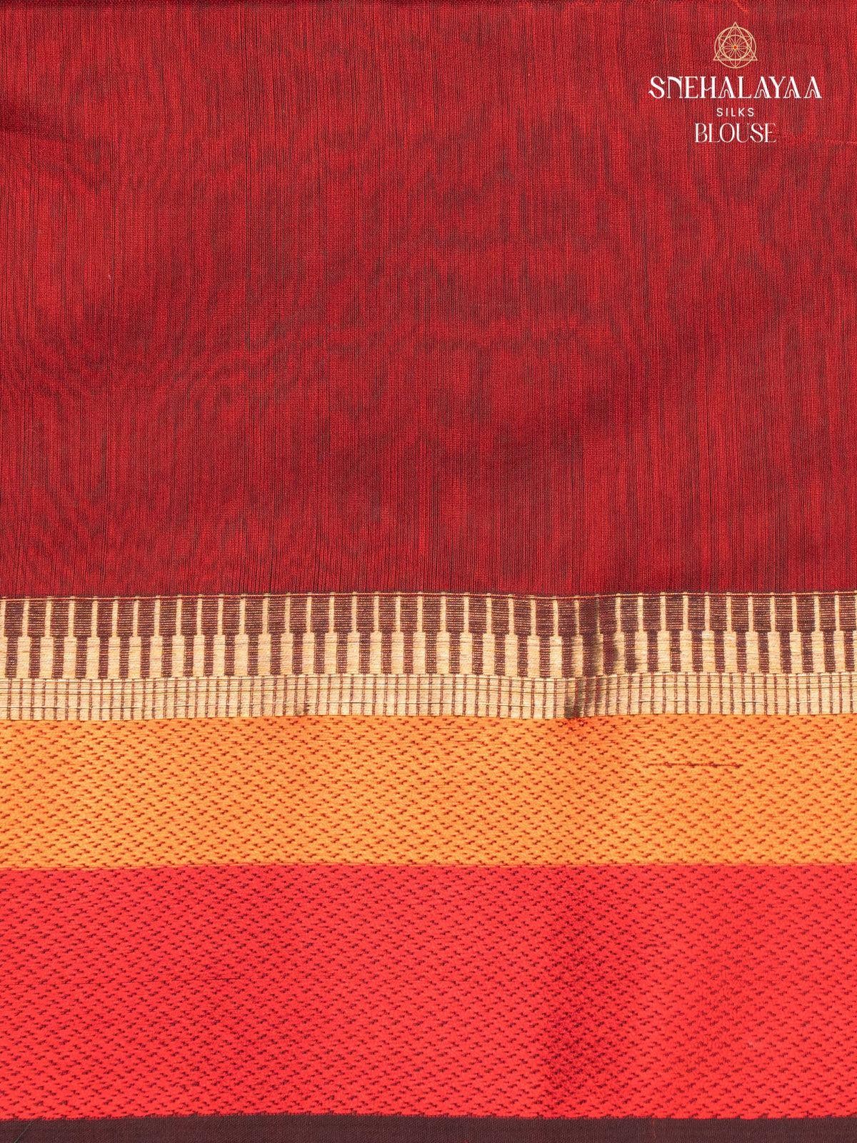A Maheswari silk cotton saree featuring a contrast border and pallu, blending the shine of silk with the comfort of cotton. The contrasting borders and pallu add vibrancy and elegance, making it perfect for festive occasions.
