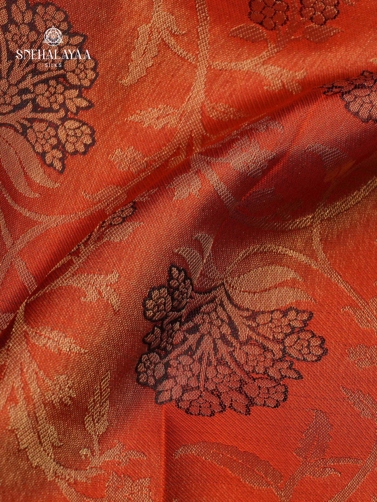 This elegant Kanjivaram silk saree features a rich orange body adorned with intricate floral vanasingaram motifs and a sophisticated dark purple border. The look is completed by a luxurious, wide gold zari border showcasing traditional geometric and botanical patterns, perfect for grand festive occasions.
