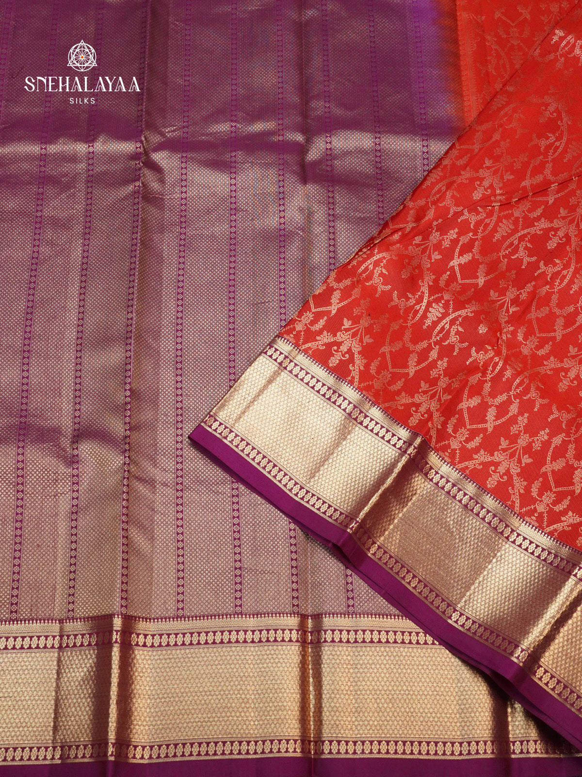 This elegant kanjivaram silk saree features a rust orange body adorned with intricate gold zari floral vines, paired with a striking deep wine-purple border. The ensemble is completed with a heavily brocaded purple pallu and a matching blouse piece, showcasing a sophisticated blend of traditional craftsmanship and contrasting jewel tones.