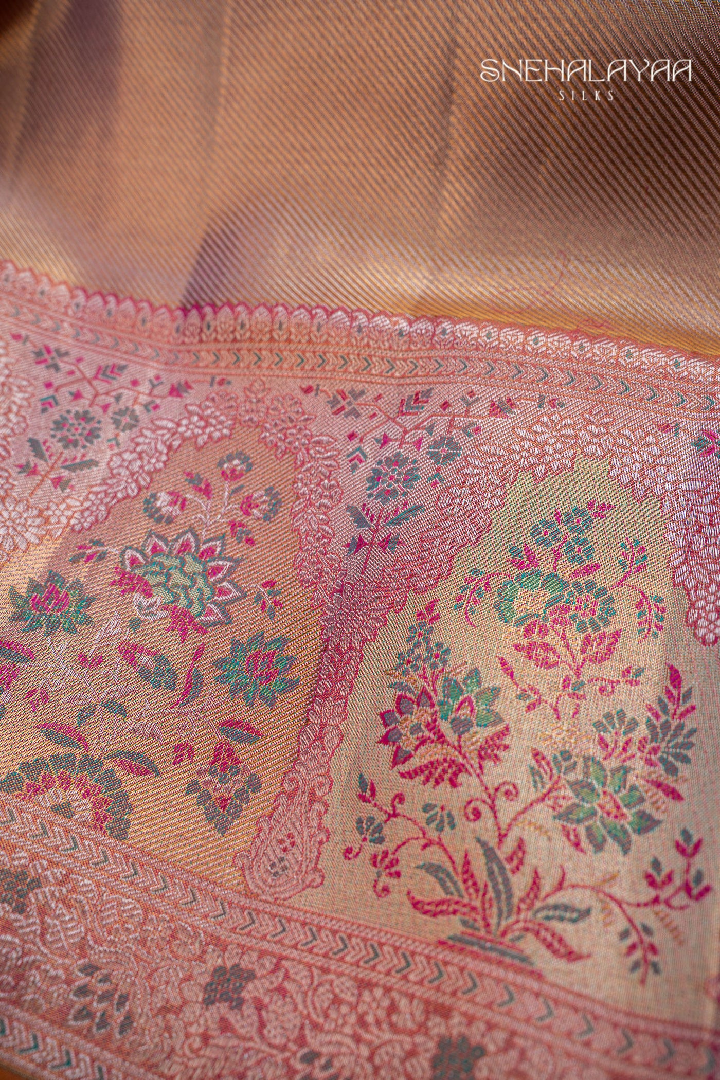 Kanchipuram sarees are often adorned with intricate zari (gold or silver thread) work, which can feature elaborate motifs like peacocks, florals, or temple borders.