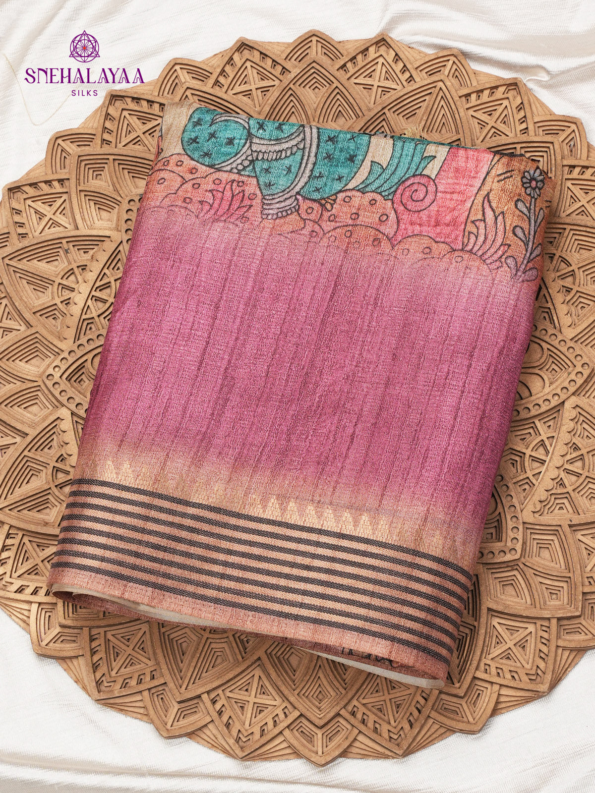 A Kalamkari tussar saree features hand drawn traditional motifs on rich, textured tussar silk. Its earthy sheen and intricate artwork create a graceful, heritage look.
