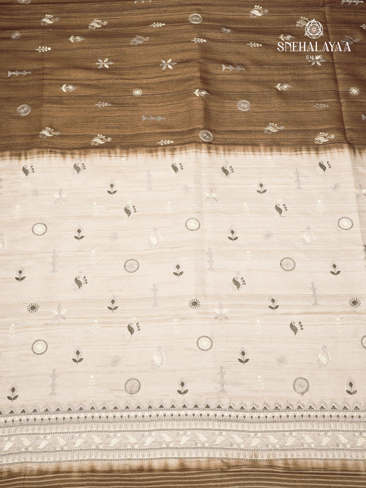 A Tussar embroidery saree blends the rich, natural texture of Tussar silk with intricate handcrafted motifs for an elegant, earthy charm. Its subtle sheen and detailed needlework make it perfect for both festive and formal occasions.