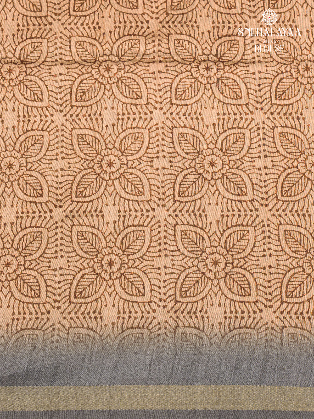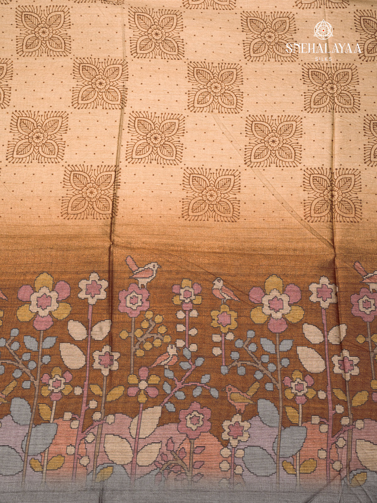A Tussar saree with floral prints features delicate, handwoven fabric with rich texture, adorned with vibrant, nature-inspired floral patterns. Its rustic charm and elegant design make it a perfect blend of traditional and contemporary style.