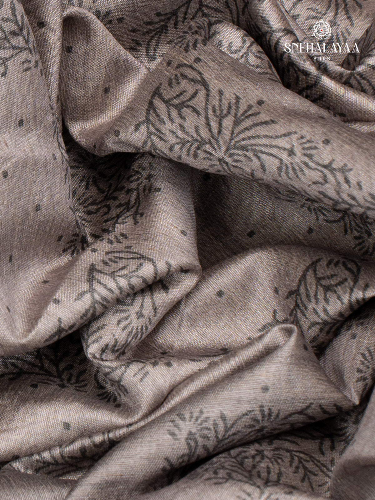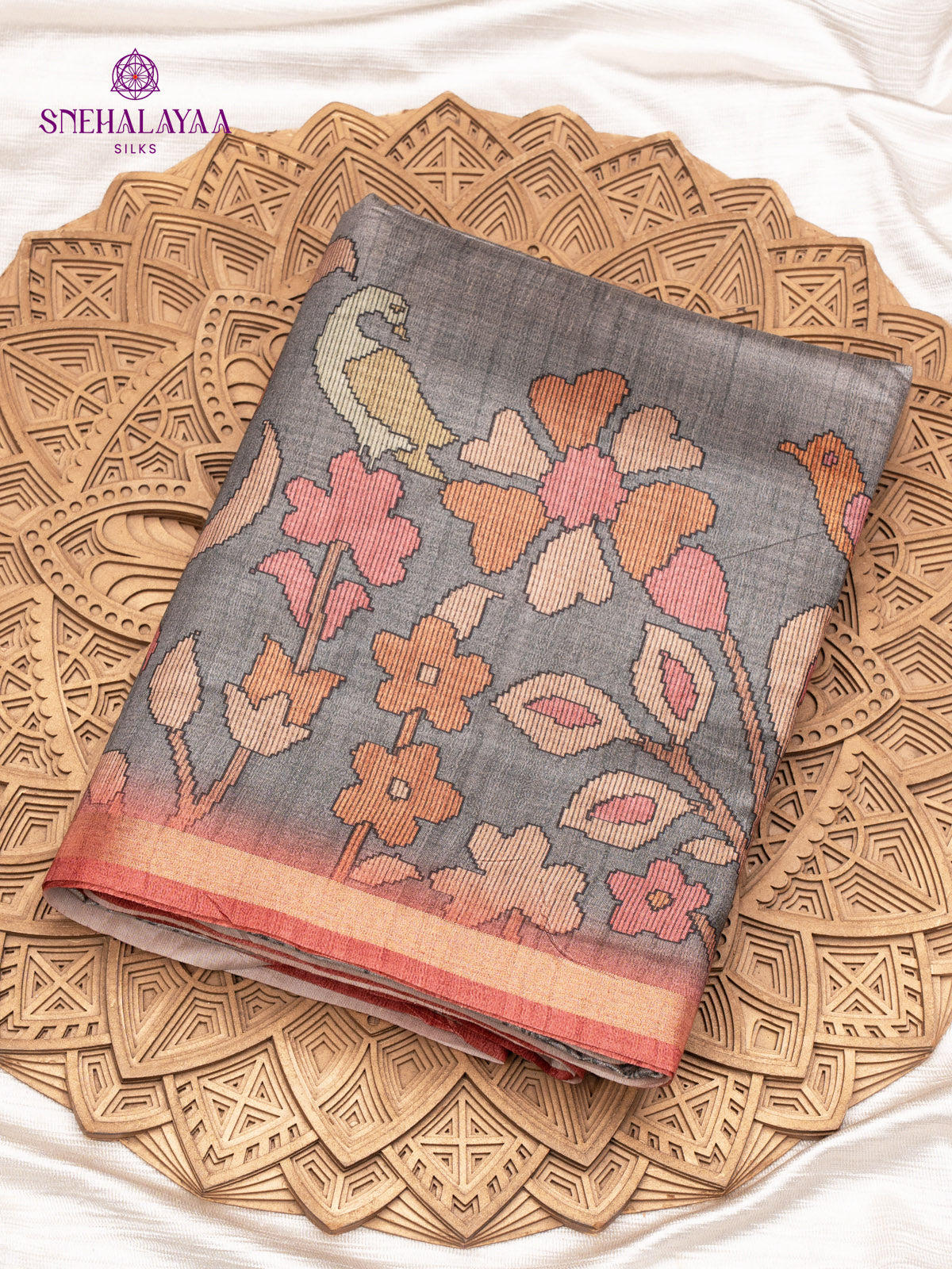 A Tussar saree with floral prints features delicate, handwoven fabric with rich texture, adorned with vibrant, nature-inspired floral patterns. Its rustic charm and elegant design make it a perfect blend of traditional and contemporary style.