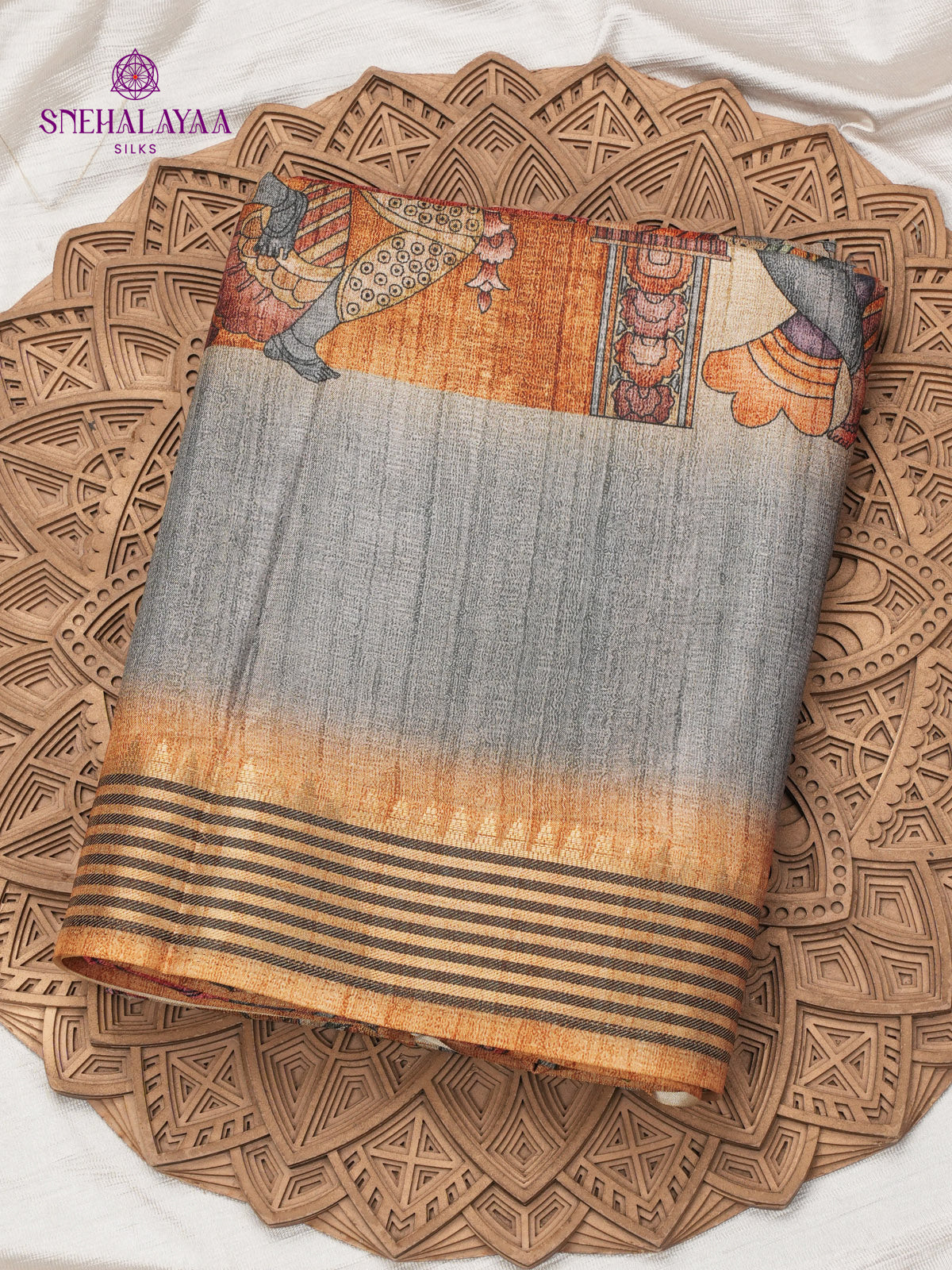 A Kalamkari tussar saree features hand drawn traditional motifs on rich, textured tussar silk. Its earthy sheen and intricate artwork create a graceful, heritage look.