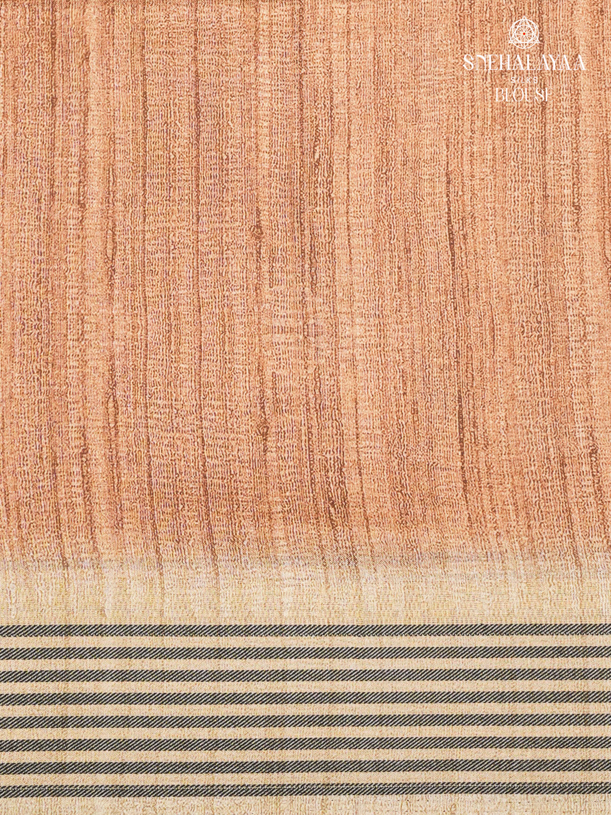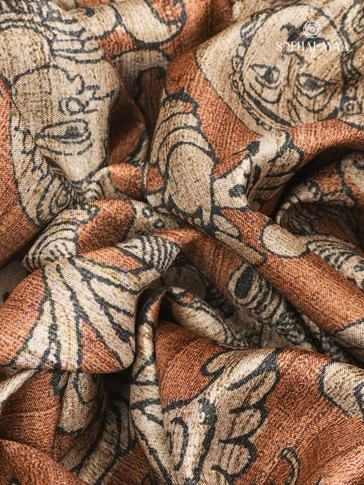 A Kalamkari tussar saree features hand drawn traditional motifs on rich, textured tussar silk. Its earthy sheen and intricate artwork create a graceful, heritage look.