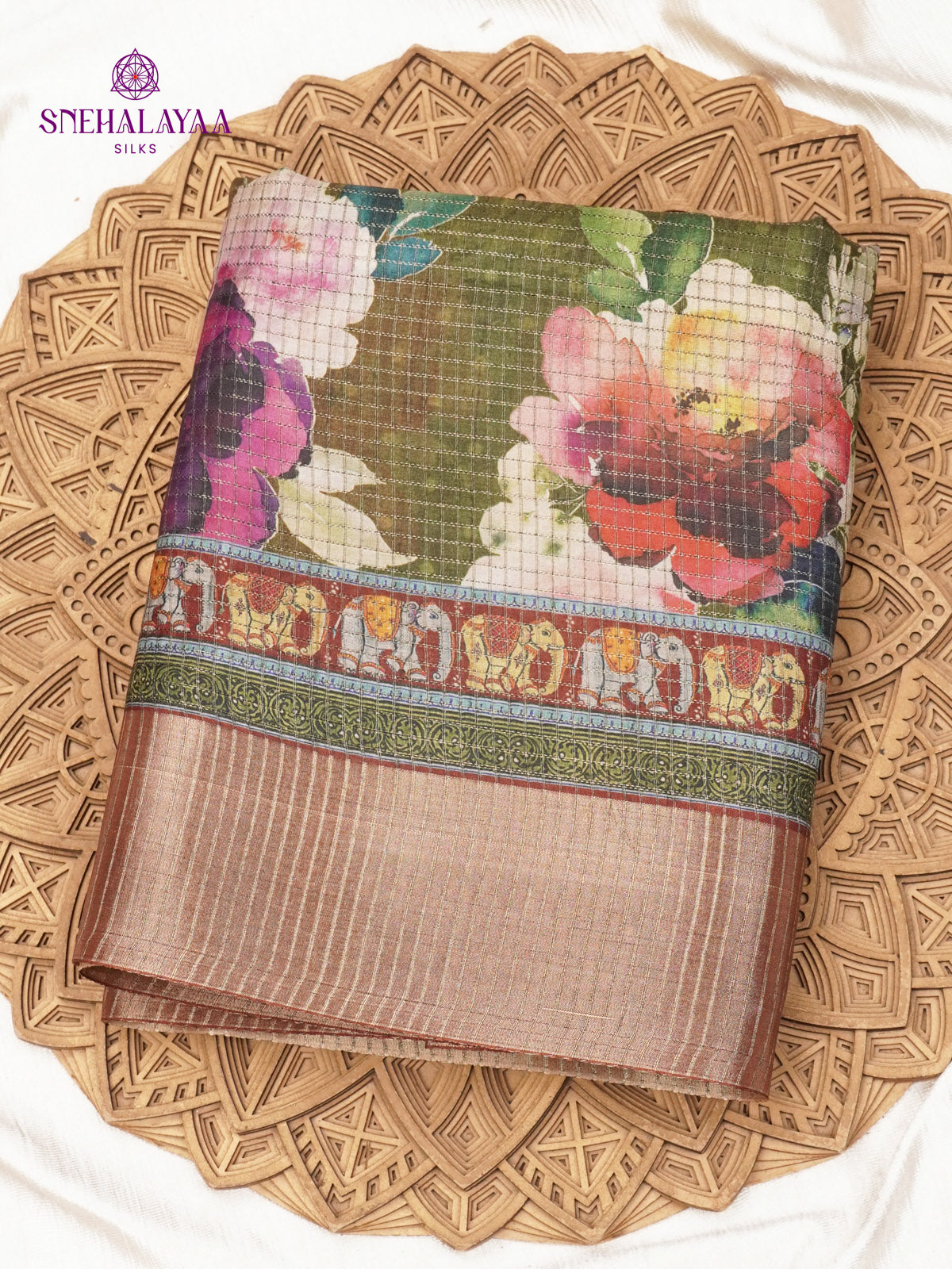Beautifully printed Tussar with blooming floral patterns that stand out. Its subtle sheen and breathable feel make it a versatile wardrobe favorite.