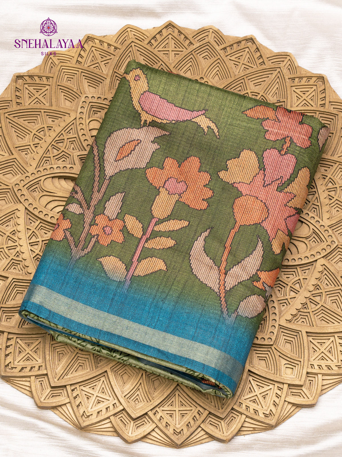 A Tussar saree with floral prints features delicate, handwoven fabric with rich texture, adorned with vibrant, nature-inspired floral patterns. Its rustic charm and elegant design make it a perfect blend of traditional and contemporary style.