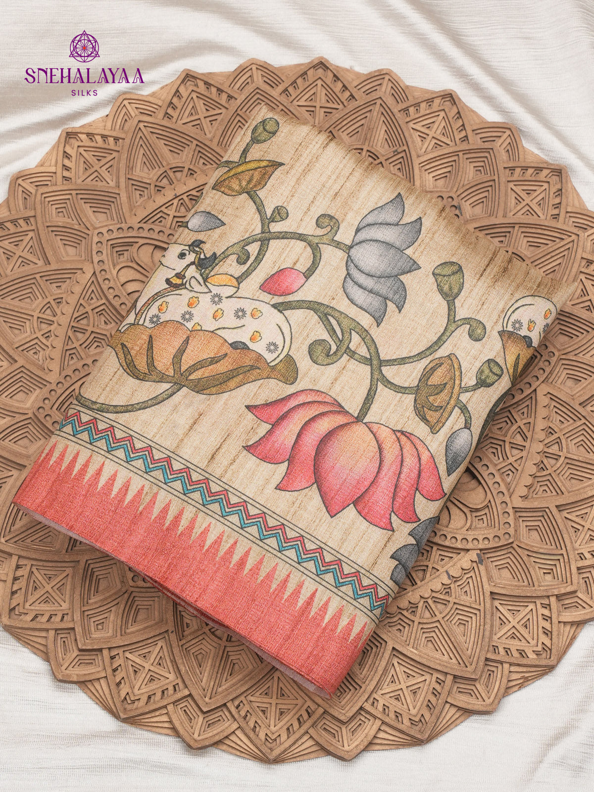 A Kalamkari tussar saree features hand drawn traditional motifs on rich, textured tussar silk. Its earthy sheen and intricate artwork create a graceful, heritage look.