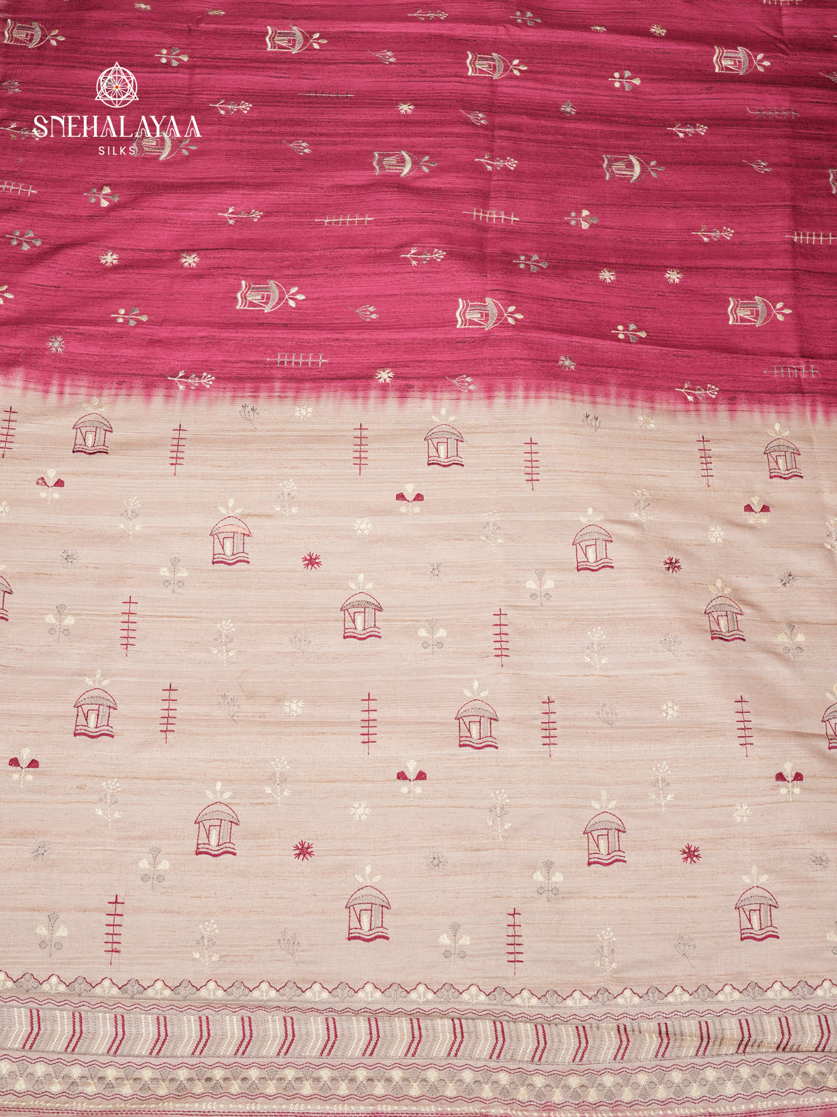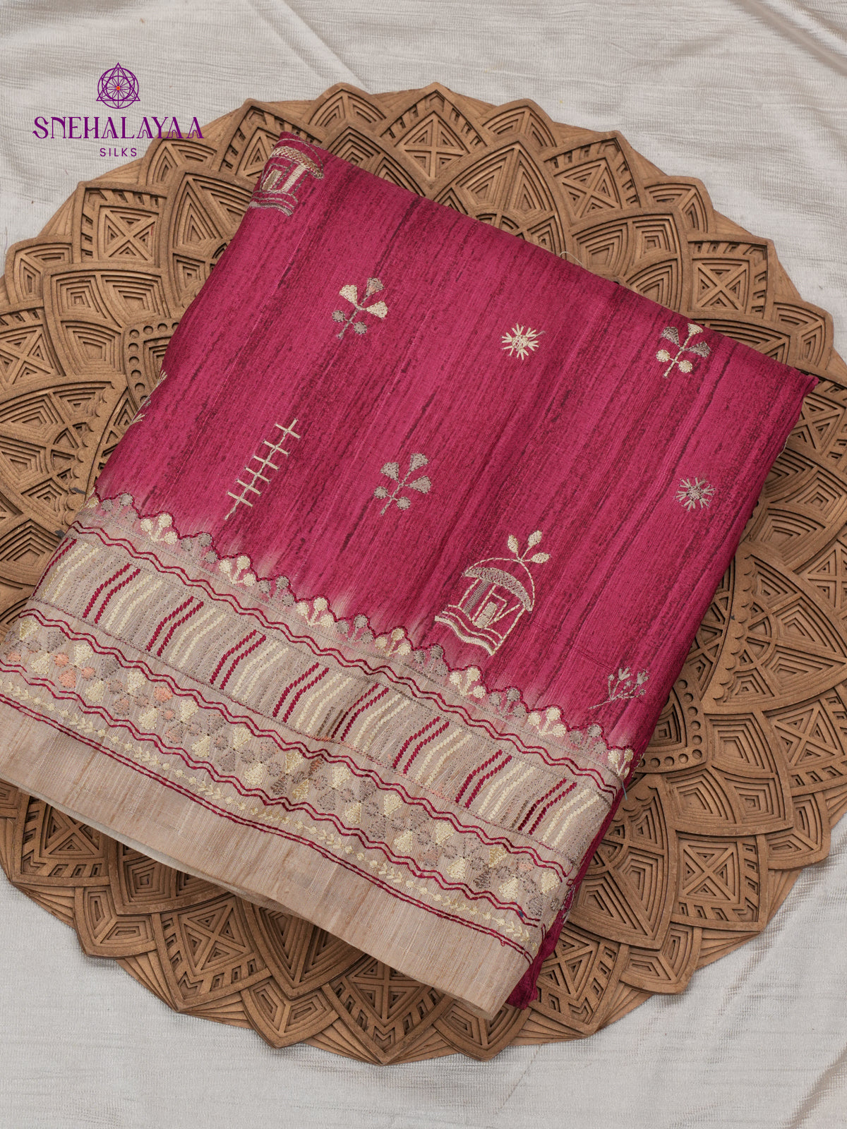 A Tussar embroidery saree showcases the natural texture and earthy elegance of Tussar silk enhanced with intricate handcrafted embroidery. It offers a refined, graceful look ideal for festive occasions and elegant daytime wear.