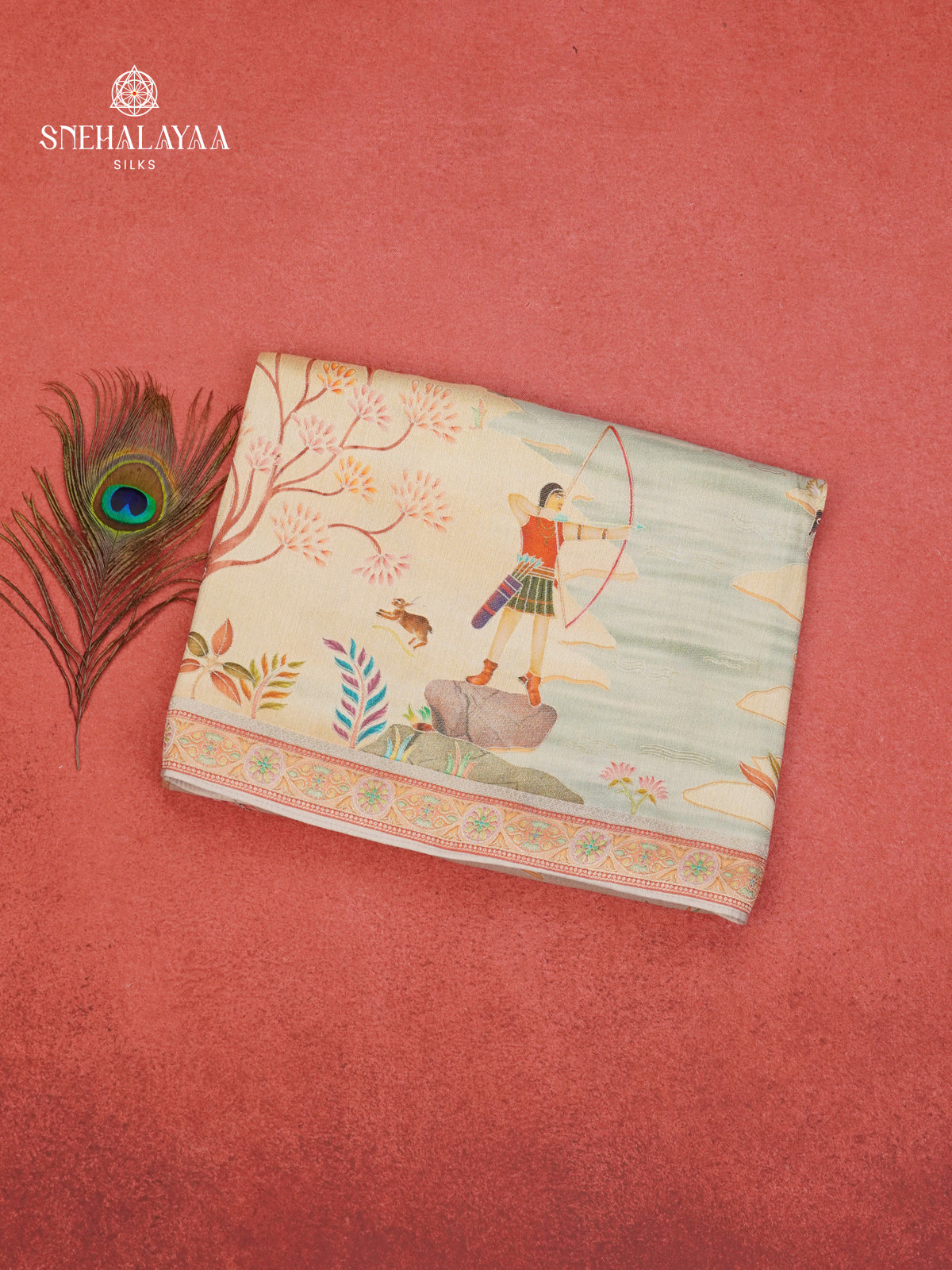 A soft tissue tussar saree featuring a finely detailed artistic print inspired by classic Indian storytelling, complemented by a subtle woven border. Lightweight with a gentle sheen, this saree is ideal for festive gatherings and cultural occasions.