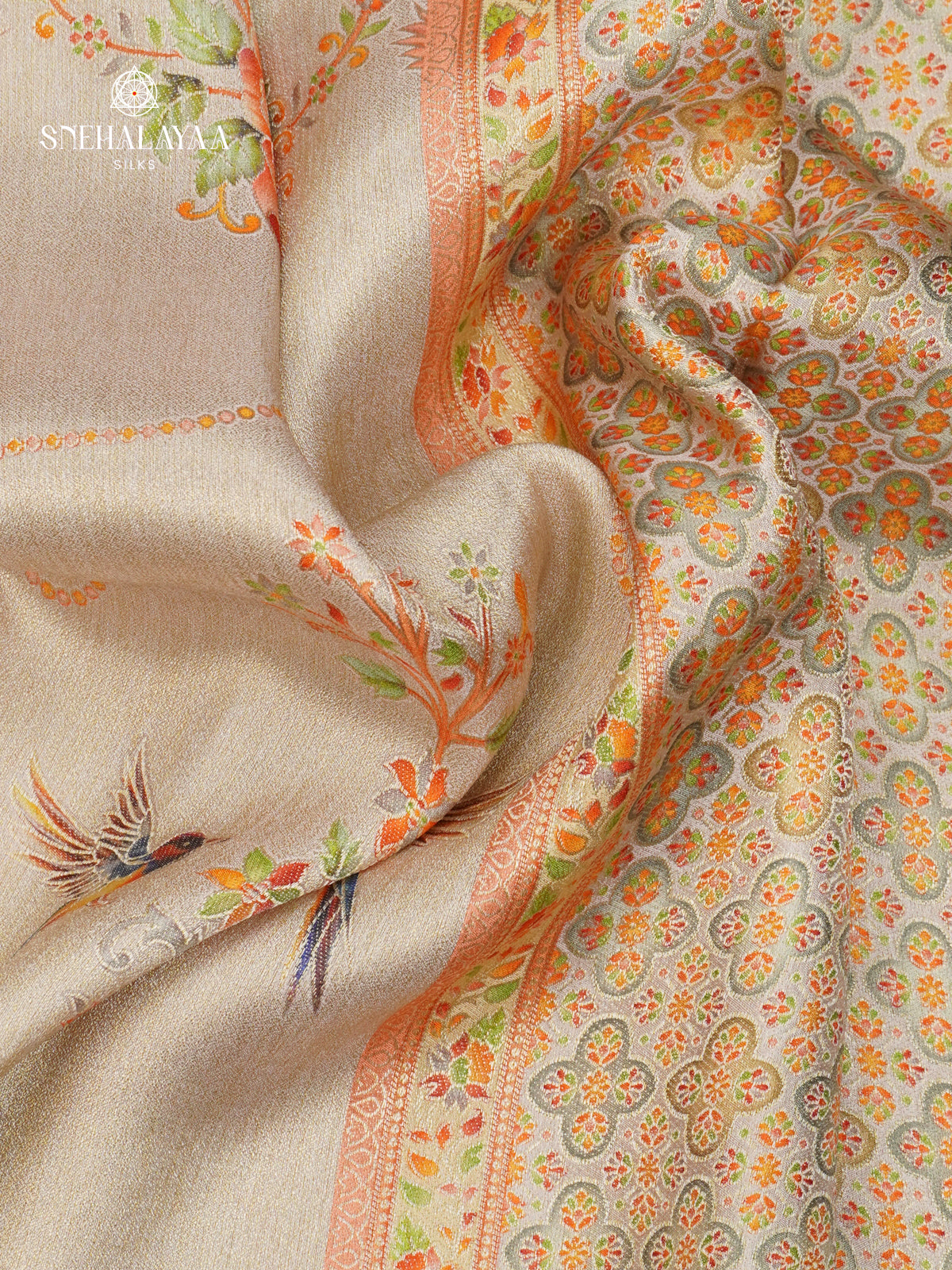 A soft Cream tissue tussar saree adorned with delicate artistic prints inspired by nature and heritage motifs, finished with a subtle woven border. Lightweight with a gentle sheen, this saree drapes effortlessly and suits refined festive and cultural occasions.