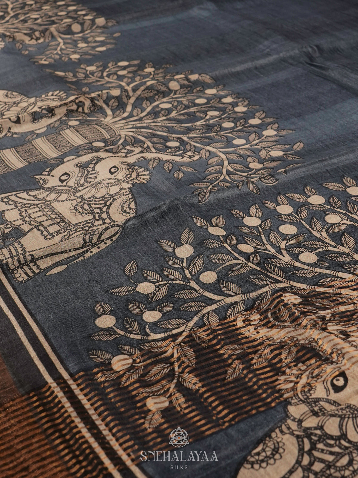A Tussar saree features a natural golden glow and a rich, textured weave from wild silk. It reflects timeless elegance with an earthy, handcrafted appeal.