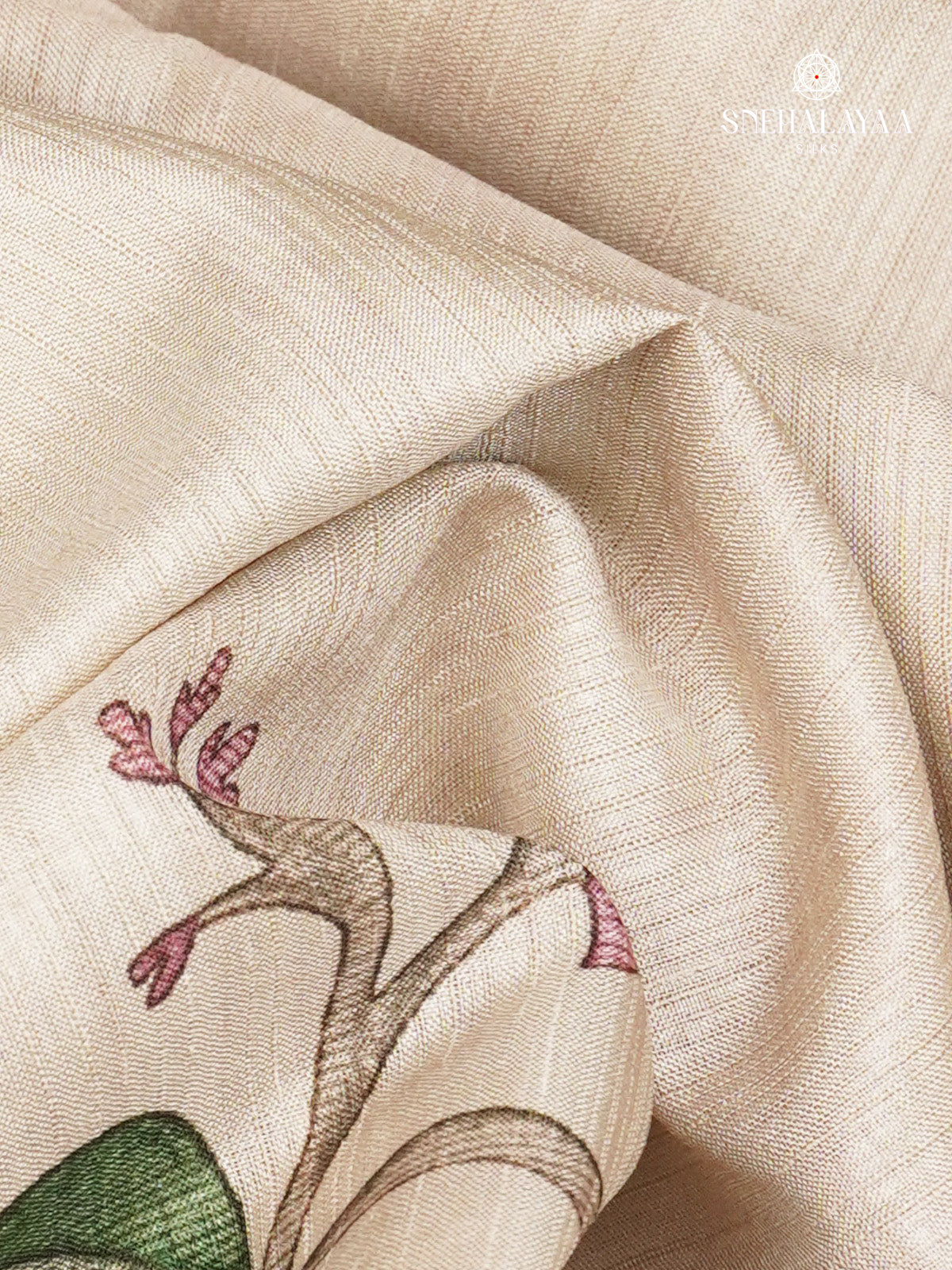 A tussar contemporary-style saree blends the rich, natural texture of tussar silk with modern motifs and minimalist elegance.
