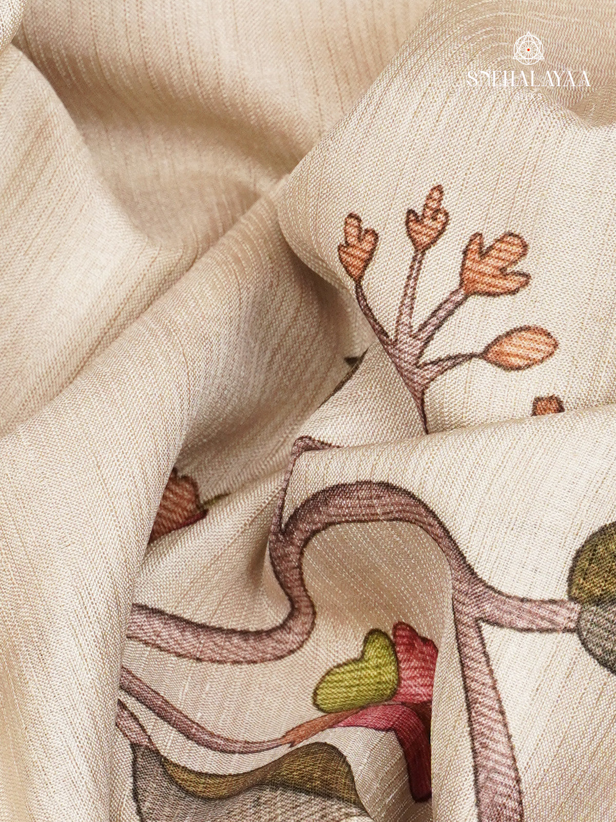 A tussar contemporary-style saree blends the rich, natural texture of tussar silk with modern motifs and minimalist elegance.